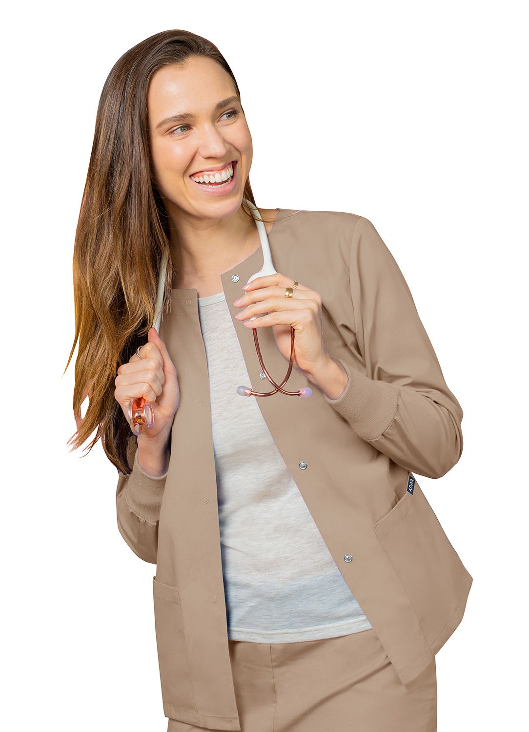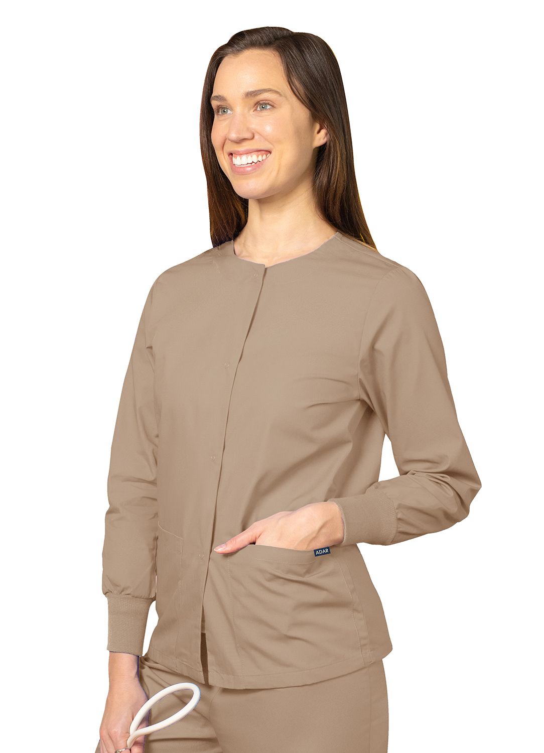 Spiff up a simple pair of scrubs or get an extra layer against the air conditioning. Our round neck warm-up jacket are roomy enough to fit comfortably over scrubs, yet look sleek and put together worn over a t-shirt. Stitched neckline, four snap-front closure and knit cuffs. Center back length 29"