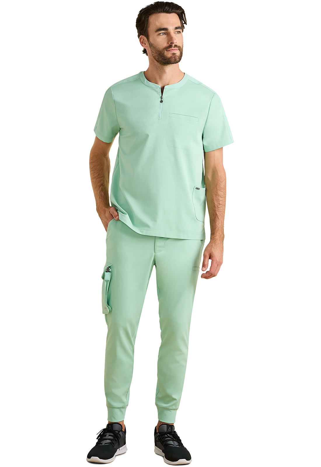• The Healing Hands x Dr. Kwane Men's Victor top features a quarter zip at the center front neck for style plus easy on and off. This Men's scrub top includes a mandarin collar and racer-style sleeve panels with dyed-to-match knit trim for sporty detailing. There are two pockets for storage: one welt chest pocket and one side patch pocket. Side vents at hem provide ease of movement. Modern fit. Center back length: 28 1/2"