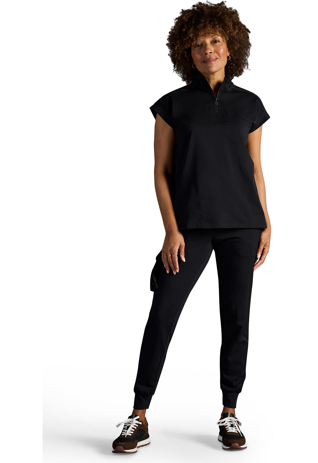 • The Healing Hands x Dr. Kwane Vienna top features a stand-up collar, quarter-zip opening, and short dolman sleeves. Dyed-to-match knit sleeves on the collar, shoulder panels, sleeve hems, and back yoke add style. There are three pockets for storage: one welt chest pocket and two welt side entry pockets. A high-low hem with side vents completes the look. Modern fit. Center back length: 26"