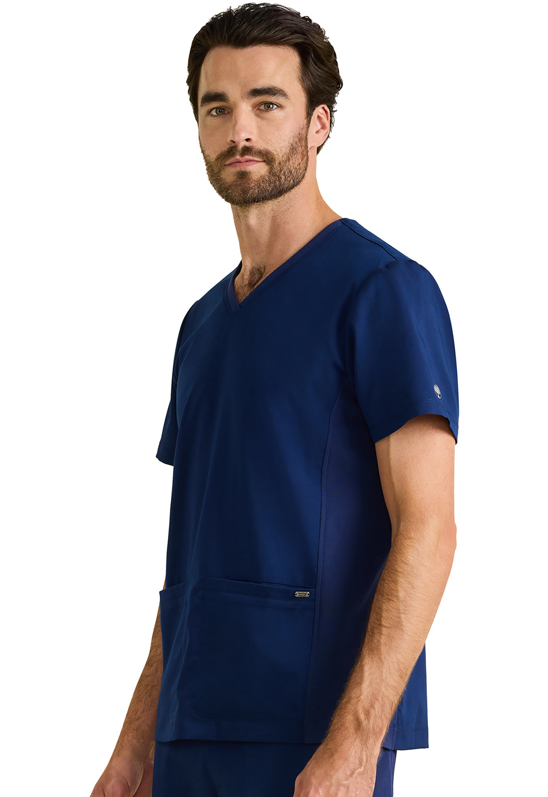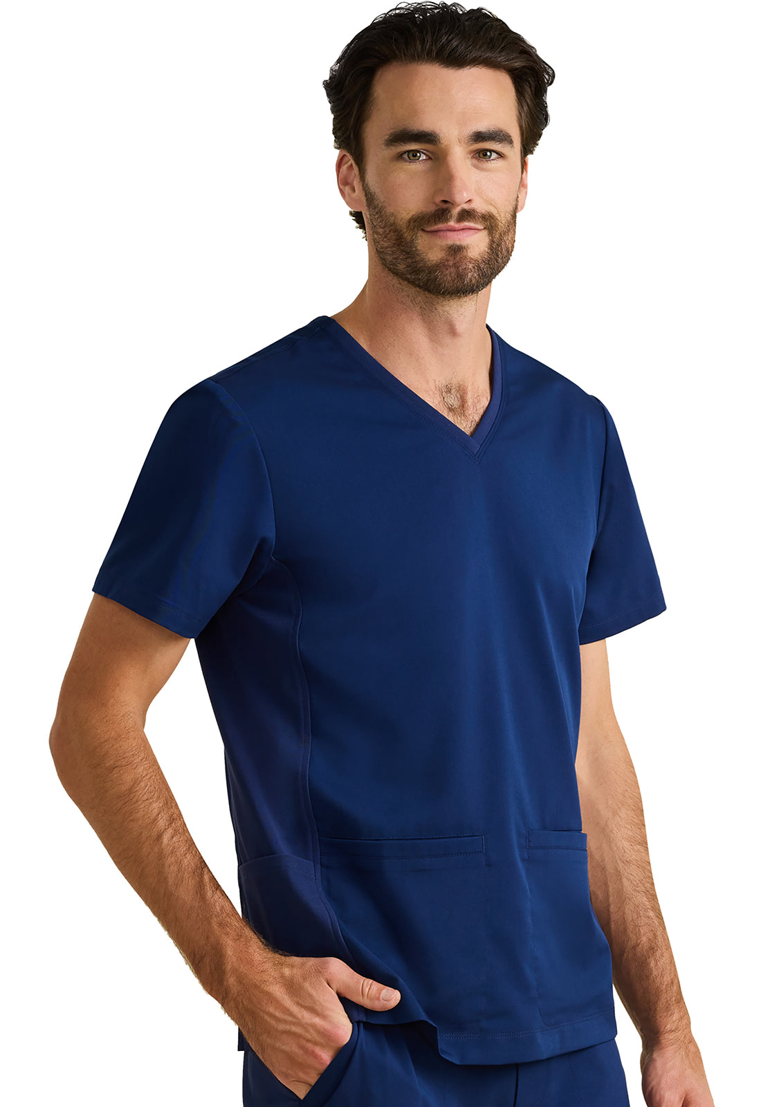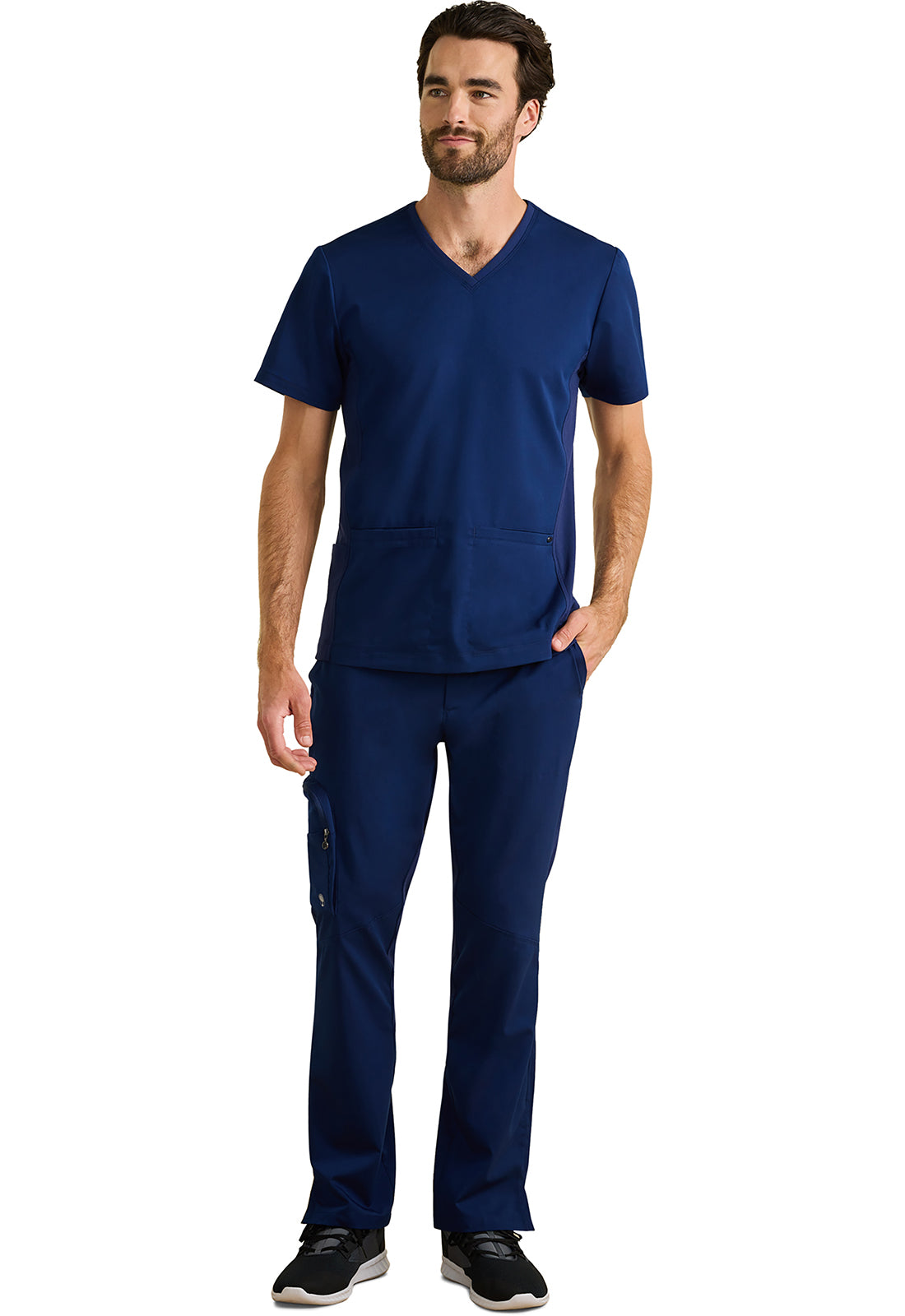 • Comfort and style combine in the Men's Vincent v-neck top from Healing Hands x Dr. Kwane. Dyed-to-match knit trim on neck band plus stylish and stretchy dyed-to-match knit side panels. There are four pockets for organized storage: two welt pockets, one hidden media pocket on the wearer's left side, and one right hip pocket. Hidden media pocket includes dyed-to-match knit trim at top of pocket. Front and back seams for fit. Back vents provide ease of movement. Modern fit. Center back length: 28 1/2"