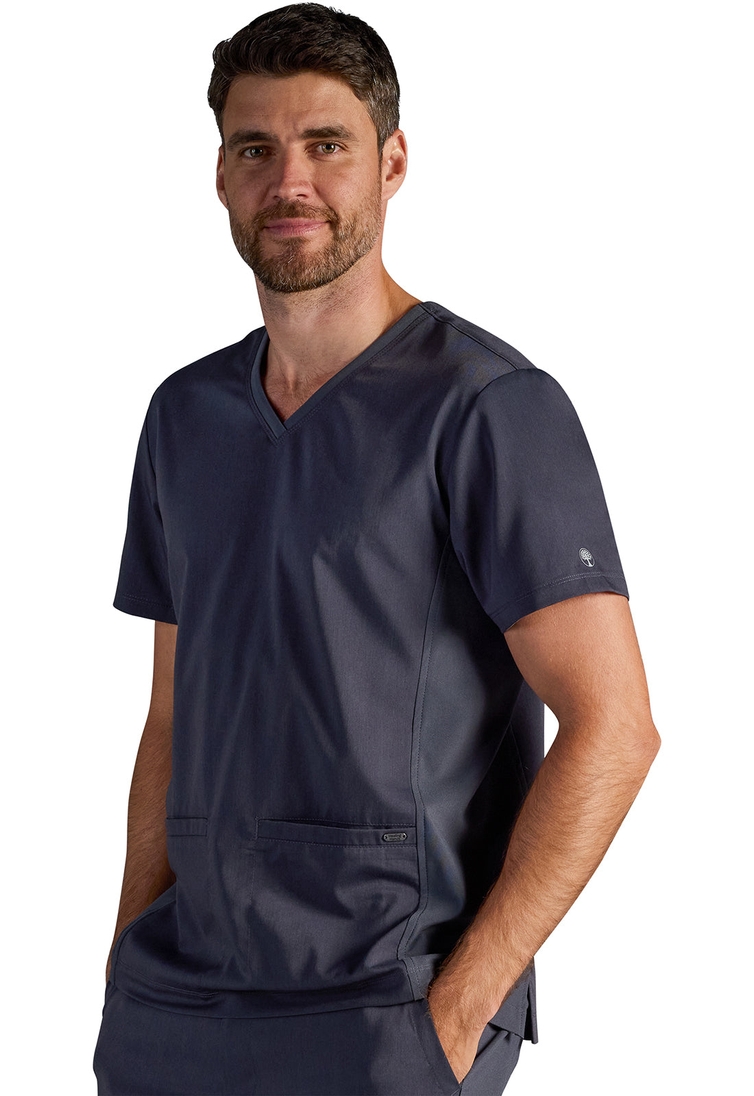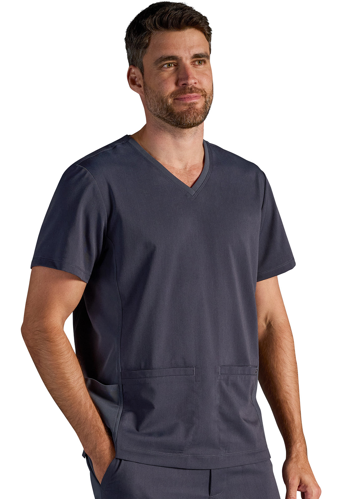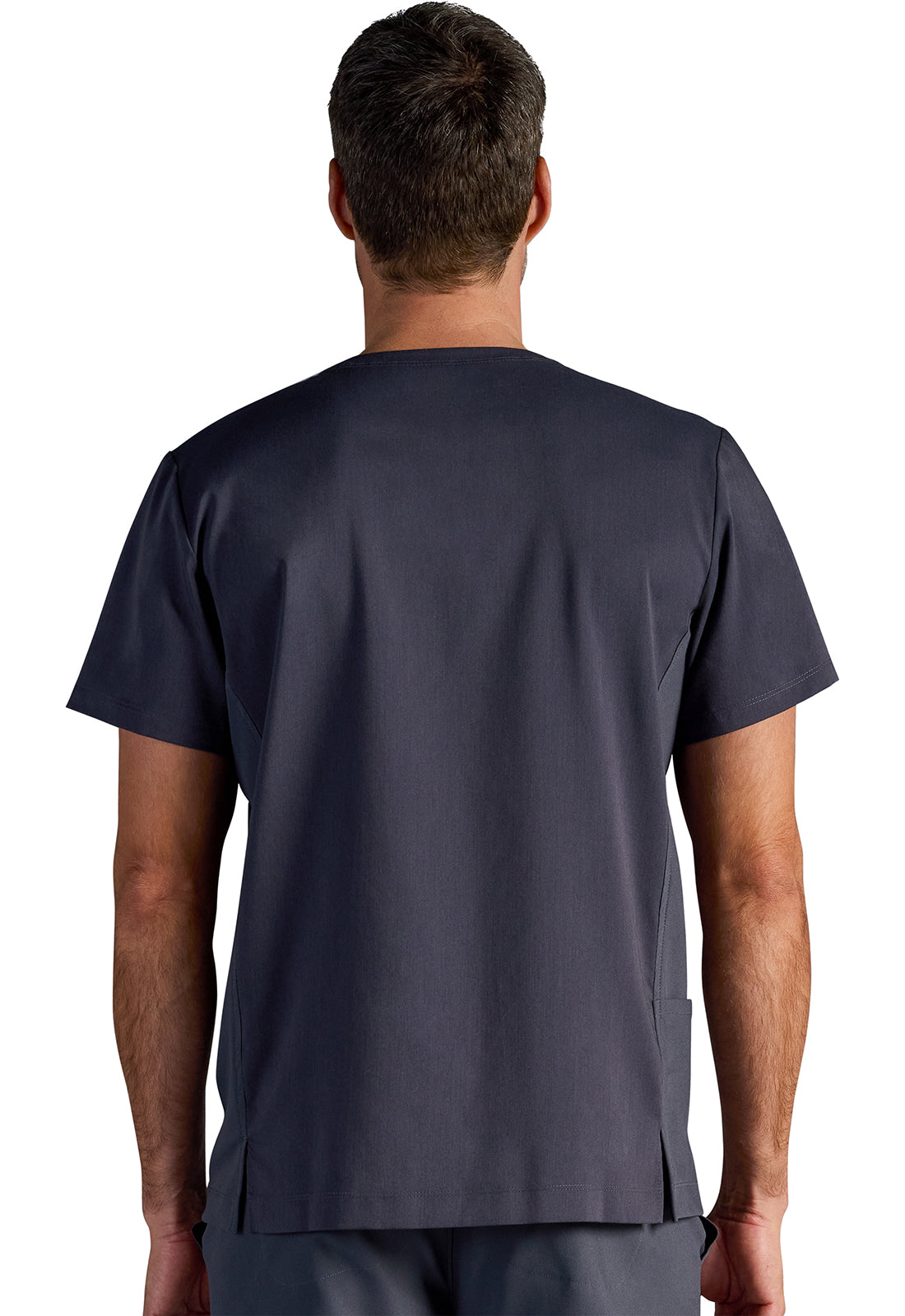 • Comfort and style combine in the Men's Vincent v-neck top from Healing Hands x Dr. Kwane. Dyed-to-match knit trim on neck band plus stylish and stretchy dyed-to-match knit side panels. There are four pockets for organized storage: two welt pockets, one hidden media pocket on the wearer's left side, and one right hip pocket. Hidden media pocket includes dyed-to-match knit trim at top of pocket. Front and back seams for fit. Back vents provide ease of movement. Modern fit. Center back length: 28 1/2"