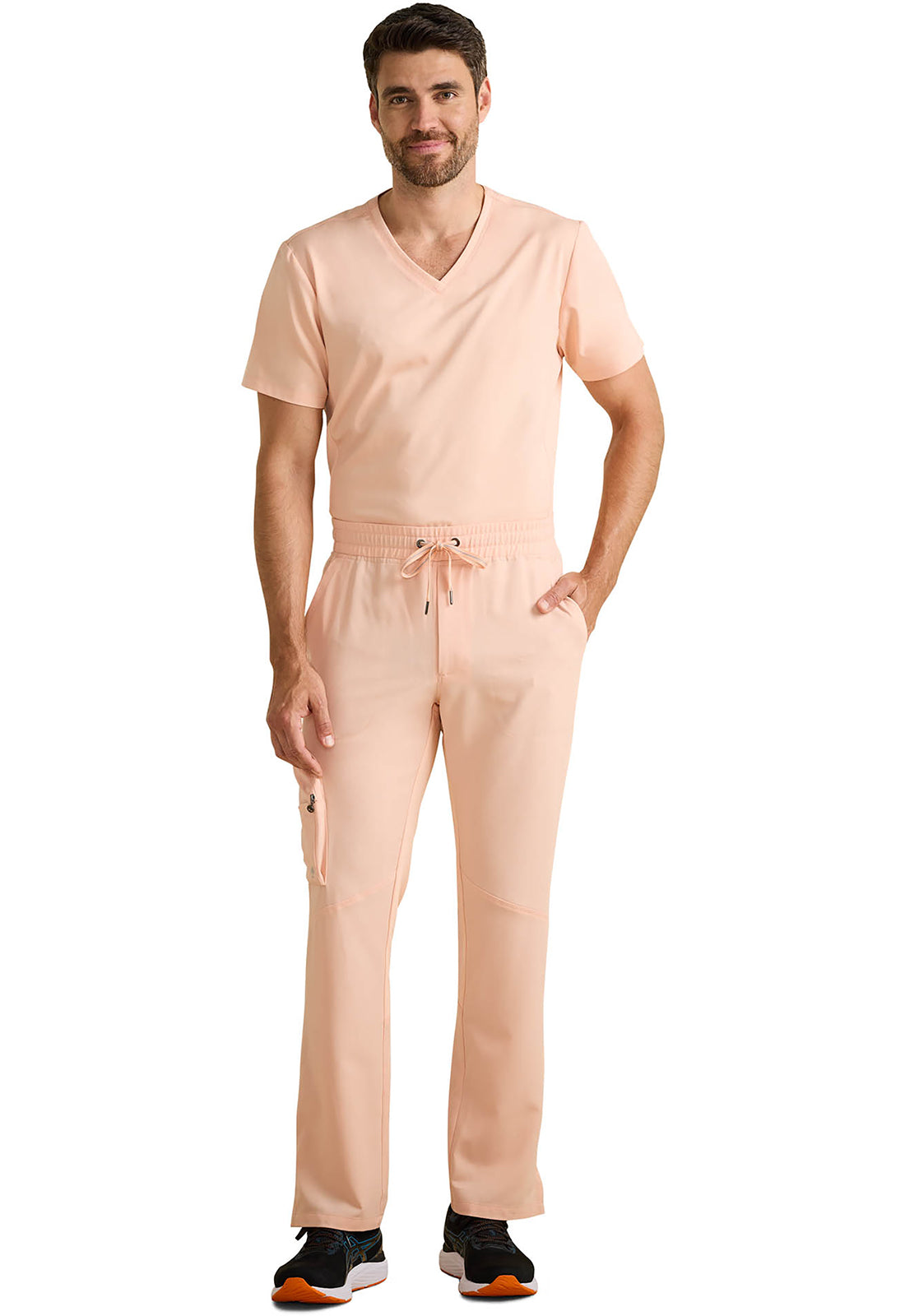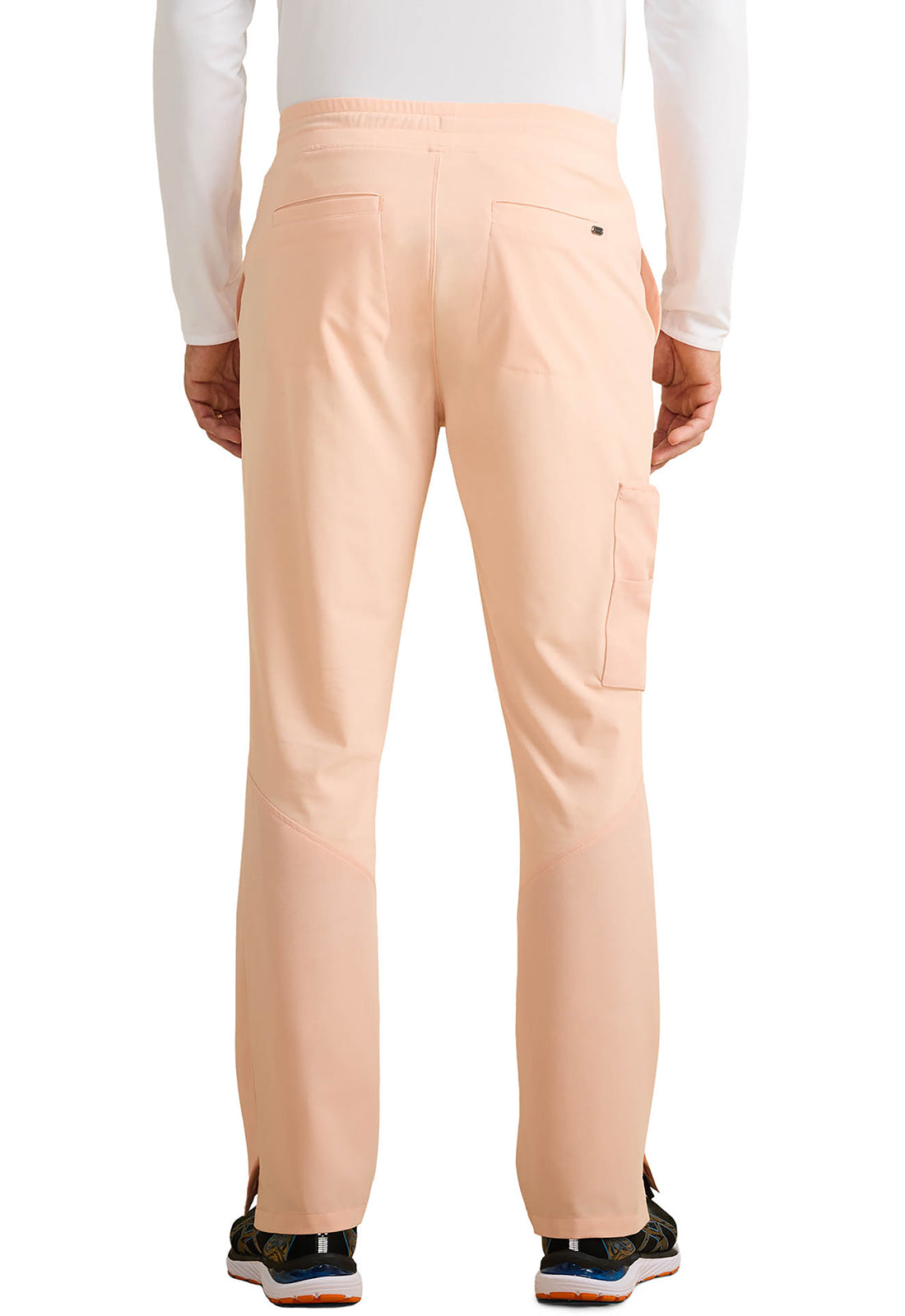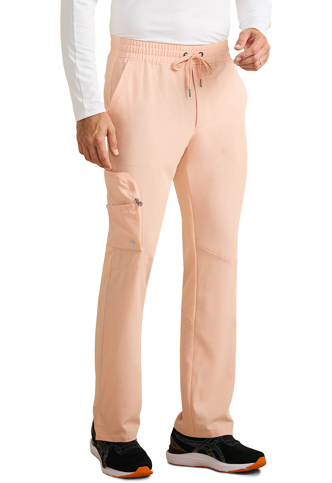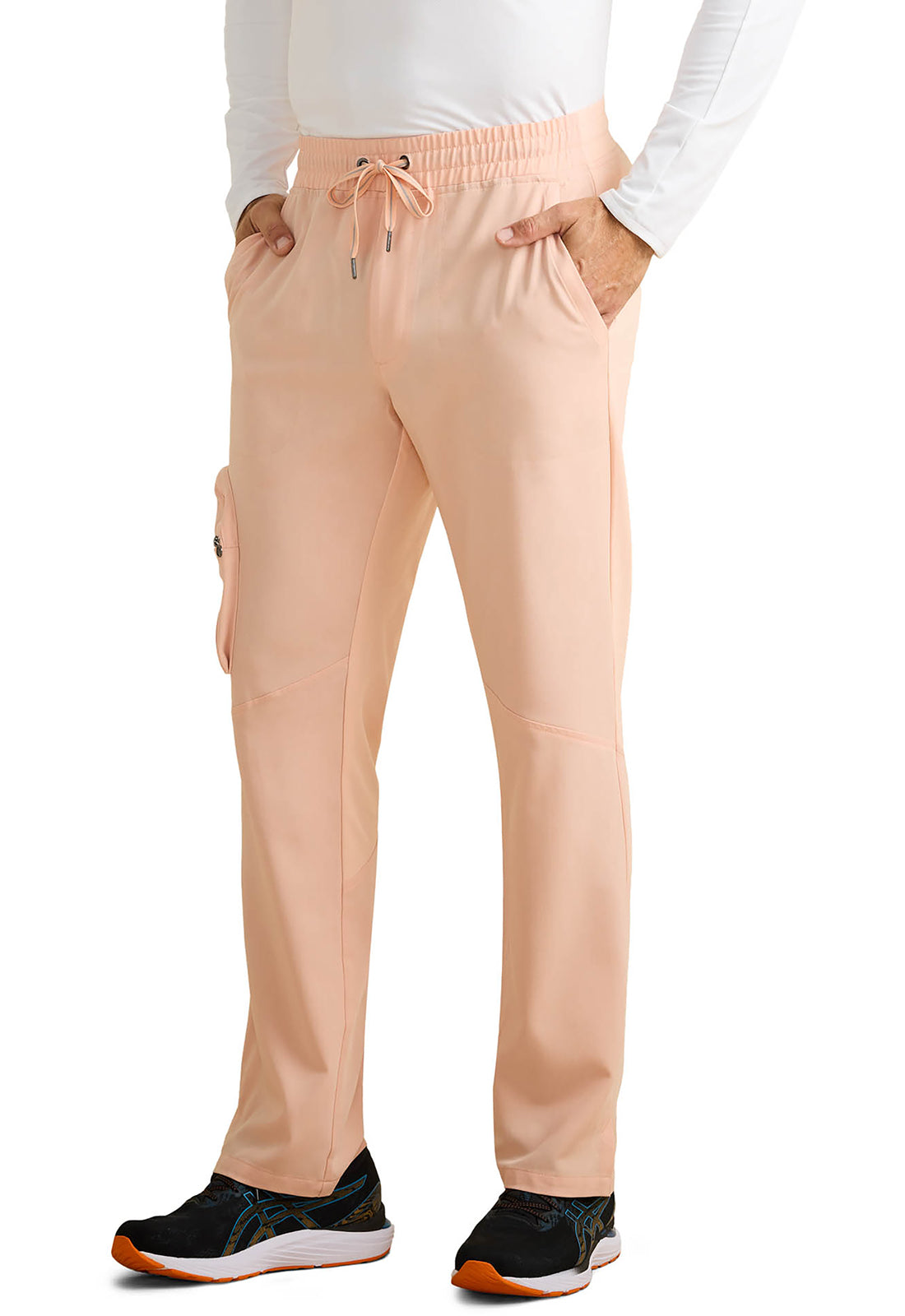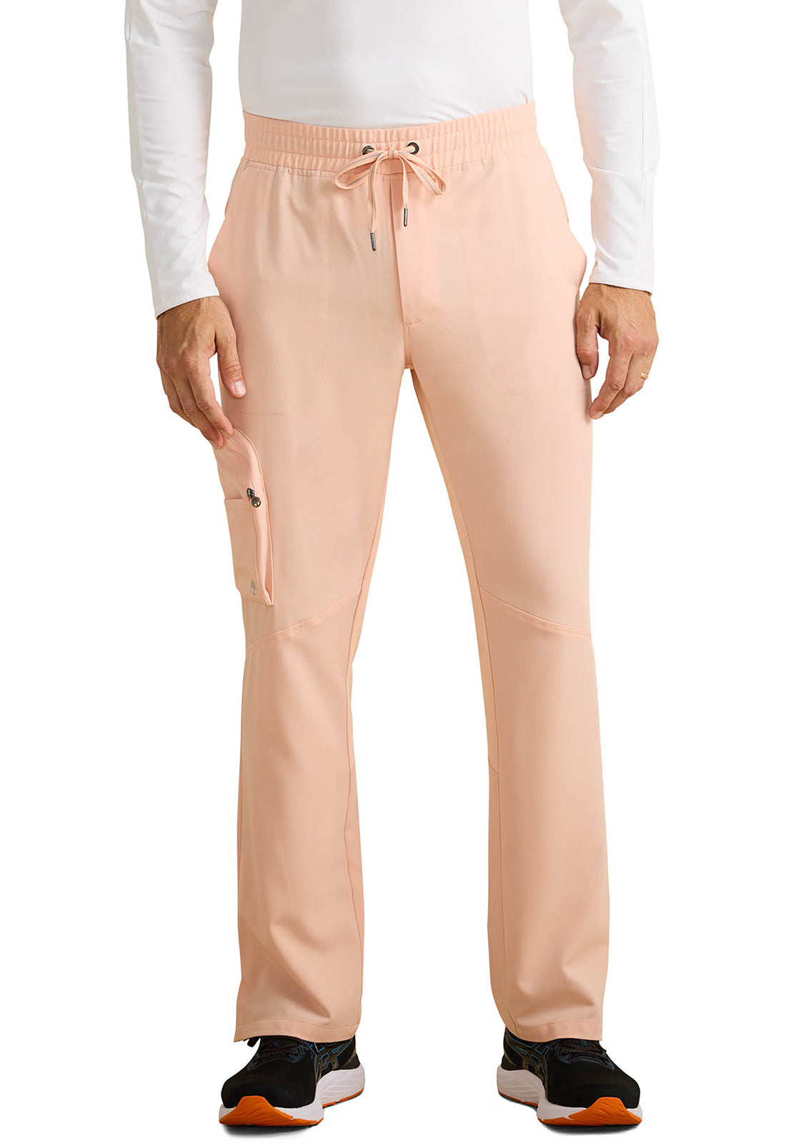 Soft woven scrub fabric on the front plus stretchy knit fabric on the back equals one very wearable Men's scrub pant. The Healing Hands x Dr. Kwane Men's Virgil mid rise zip fly pant features a flat front waistband with a drawstring and elastic back for a smooth look with adjustability and security. There are seven pockets for organized storage: two front slant pockets, one cargo pocket with an interior and exterior pocket, and two back welt pockets. Front angled knee seams and back angled leg seams add styling details. Back knit leg panels add comfort and stretch. Side vents at hem. Modern fit. Straight leg, 17" leg opening. Inseam: 31 1/2"