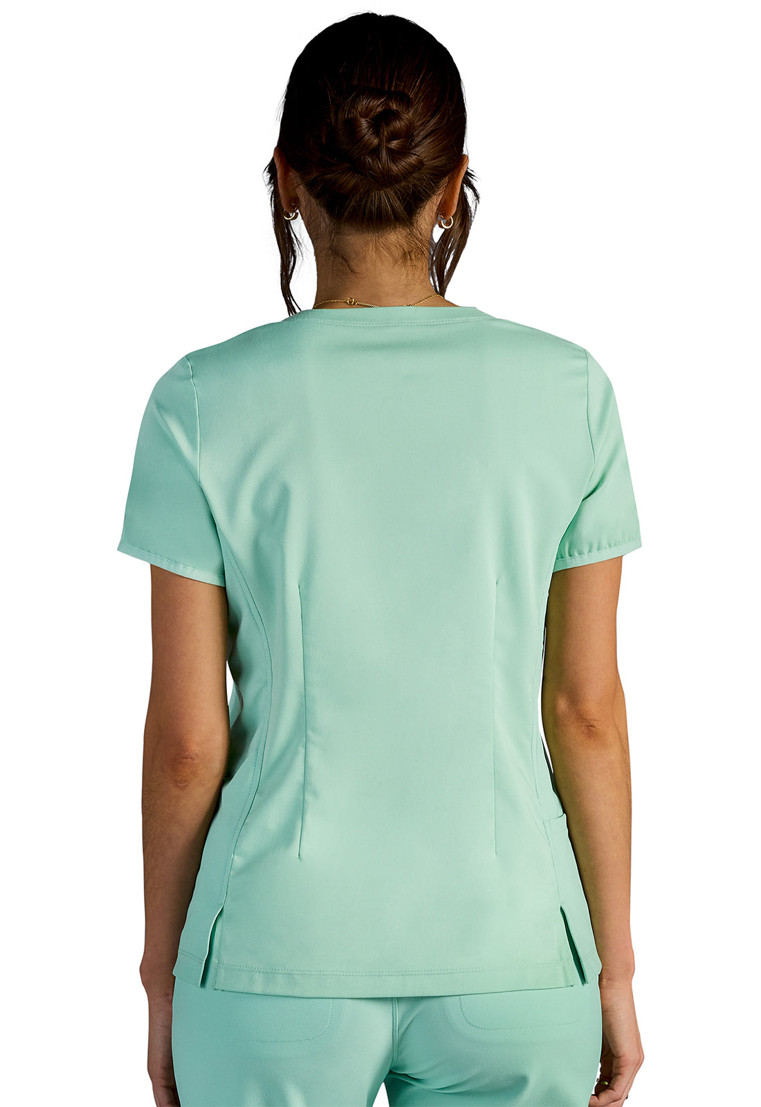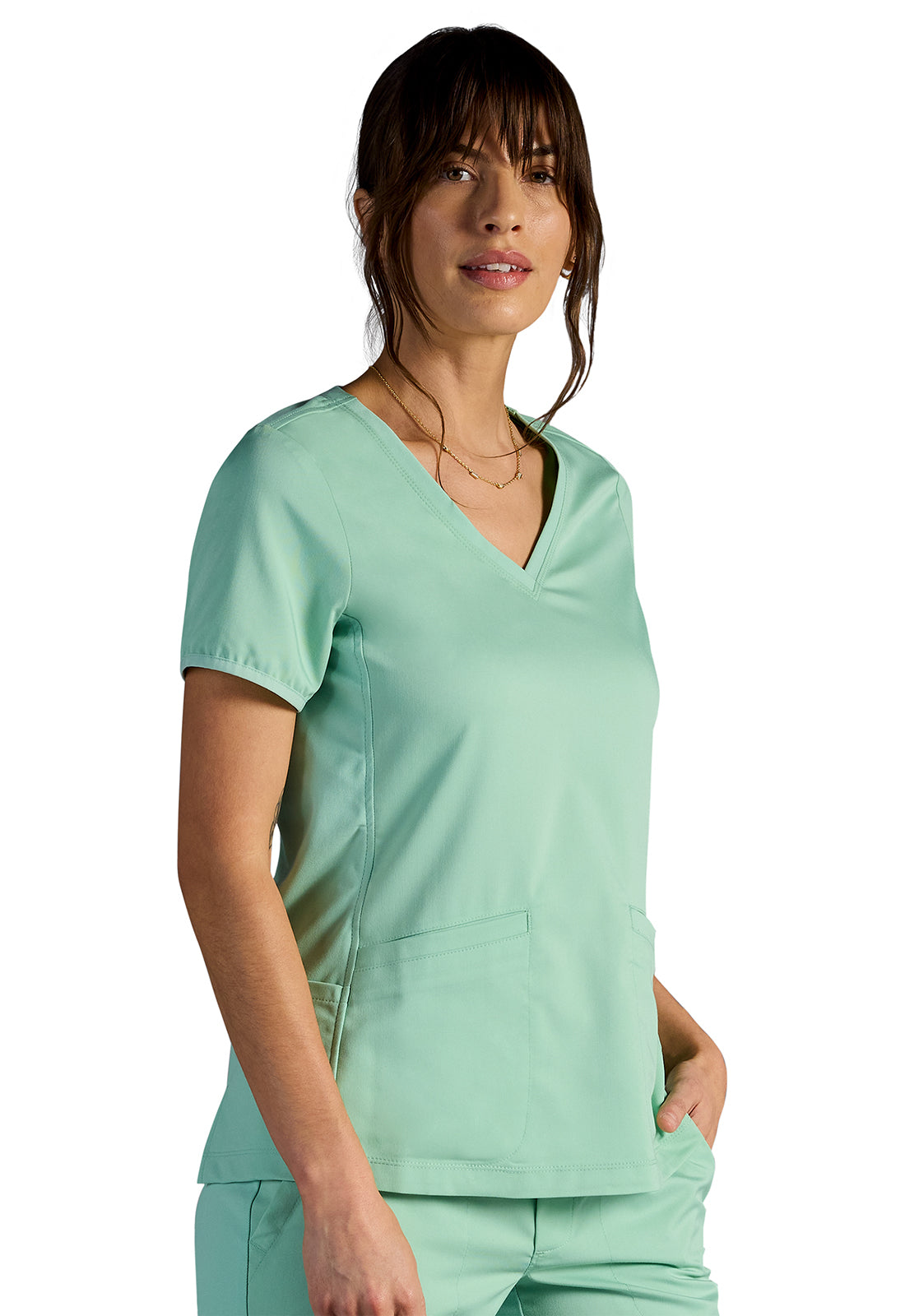 • Comfort and style combine in the Vivian v-neck top from Healing Hands x Dr. Kwane. Dyed-to-match knit trim on neck band plus stylish and stretchy dyed-to-match knit side panels. There are four pockets for organized storage: two welt pockets, one hidden media pocket on the wearer's left side, and one right hip pocket. Hidden media pocket includes dyed-to-match knit trim at top of pocket. Sleeve hems are finished with elasticized cuffs. Front and back princess seams for fit and shaping. Back darts provided added fit while back vents provide ease of movement. Modern fit. Center back length: 25"