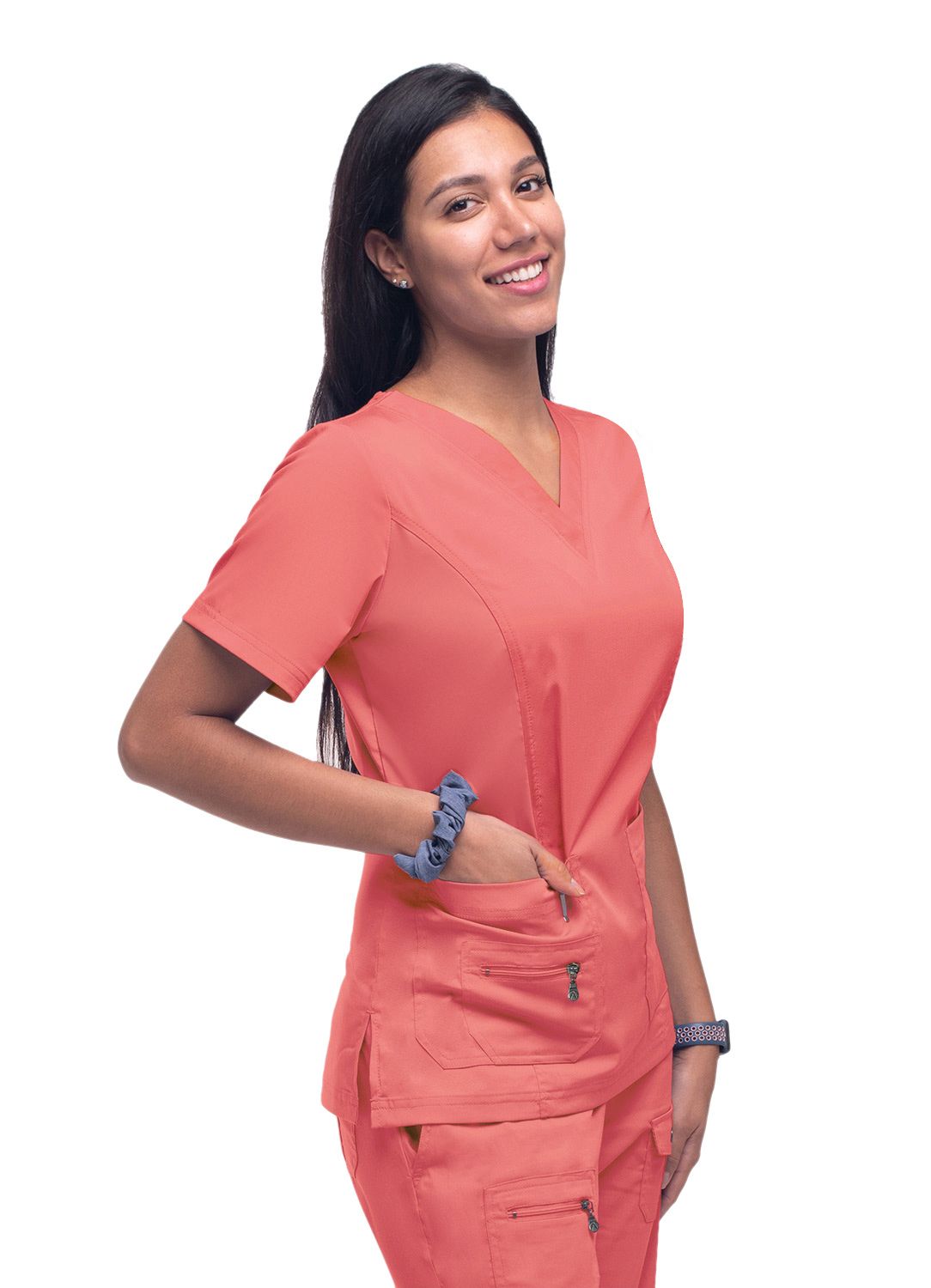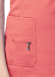 An elevated version of the classic v-neck scrub top. Beautiful details such as a double stitched neckline, back and front curved princess seams, shaped patch pockets and super soft stretch fabric truly make this scrub top a crowd favorite.Iconic Adar zipper detail adorns the front pocket. Features such as double stitching with tonal thread and odor/wrinkle resistant fabric make it just as durable as it is beautiful.