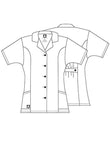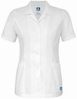 Crisply elegant traditional nurse wear is a classic staple. Princess cut fitted top features angled pockets, a lapel collar that lies flat in the neatest way and buttoned back belt detailing that creates soft shirring. Five-button front closure and stitched seams throughout. Center back length 27" in size M.