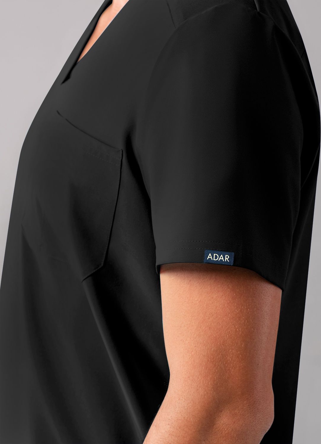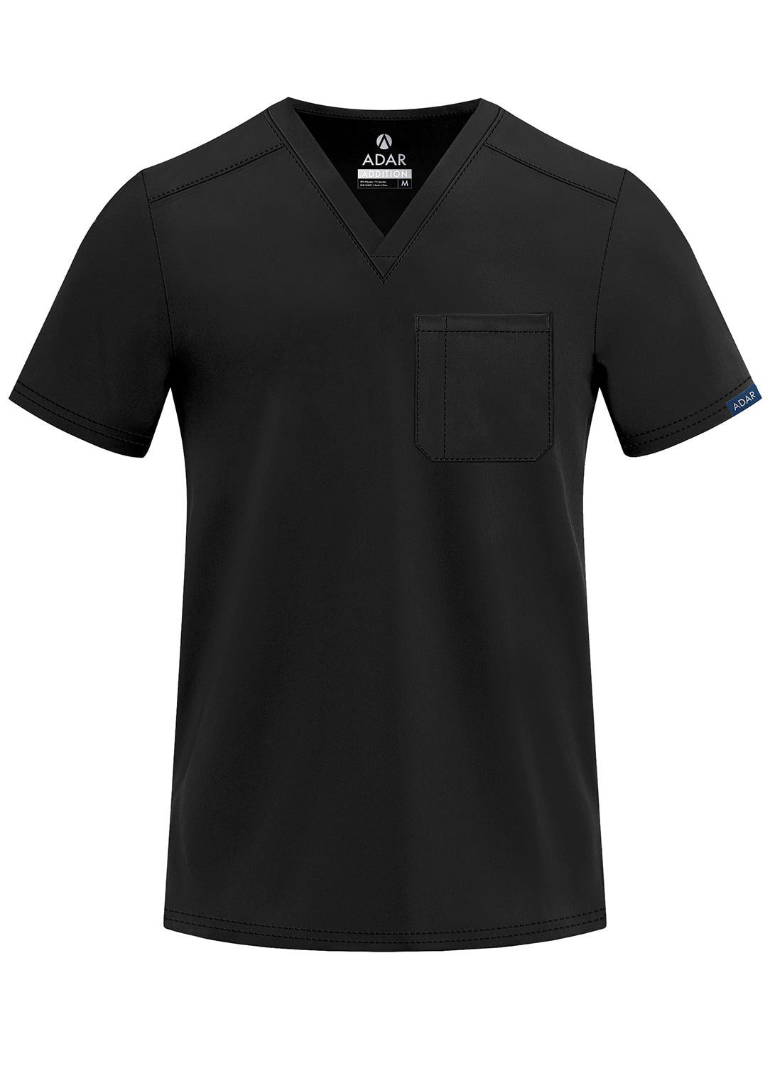 Men’s contemporary fit V-neck scrub top incorporates simple lean design with a modern edge. This top features 1 chest patch pocket with tech and pen storage. The fashionable pleated back detail and the side vents allow easy movement and flexibility while the enhanced details such as forward shoulder and back yoke seam, and ADAR brand icon on the back give this top a modern look. This style is a modern version of a classic must-have.