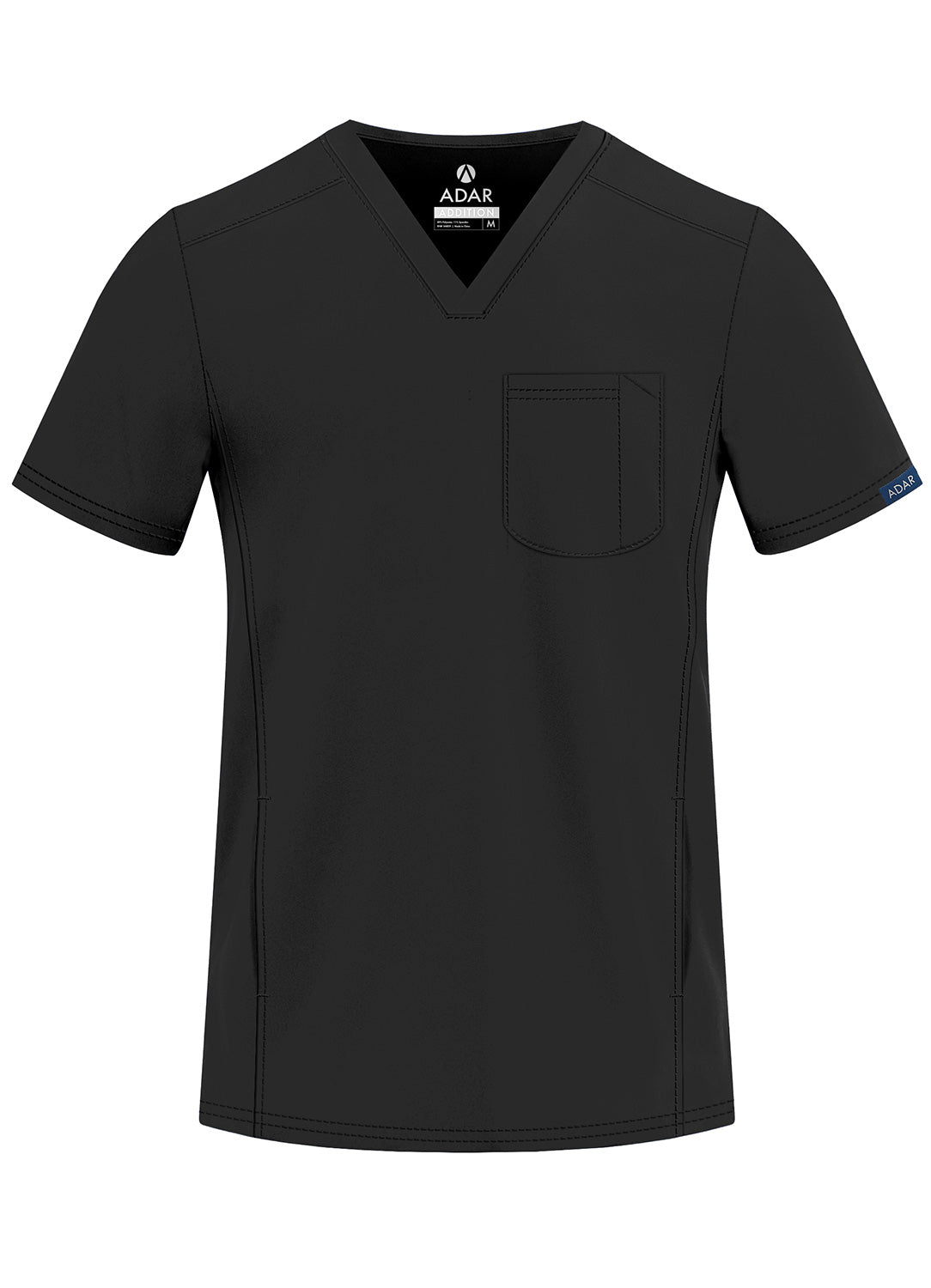 Contemporary fit stylish-yet-practical three pocket scrub top, features a shaped chest pocket with pen and tech storage, two additional hidden side entry pockets for extra storage. Our four-way stretch fabric and pleated back detail for limitless motion and maximum comfort to meet the demands of your workday. Additional details such as the forward shoulder and back yoke seam and ADAR brand icon on top of the back yoke makes this scrub top stylish and professional designed for long-shifts and lots of movement.