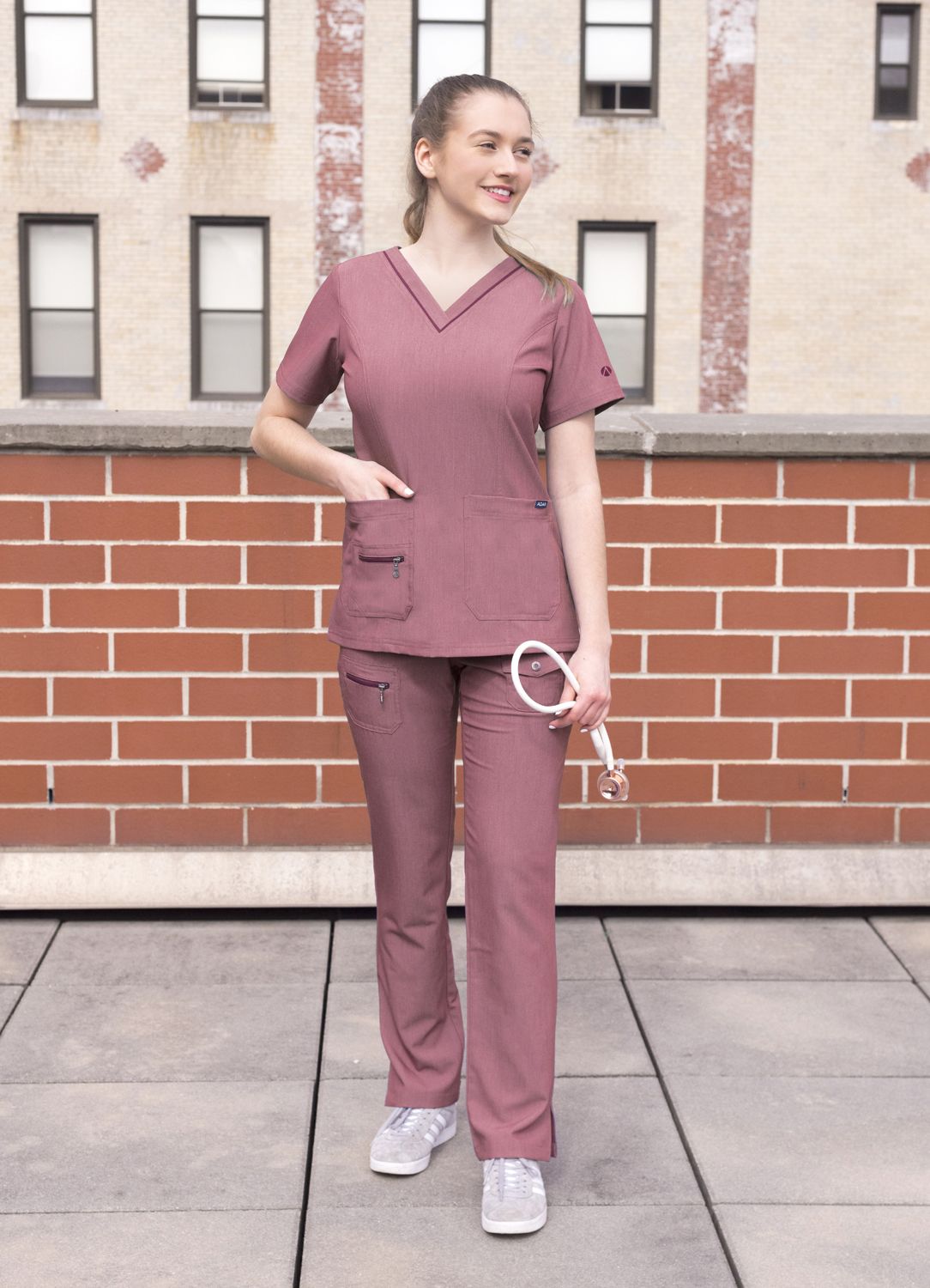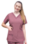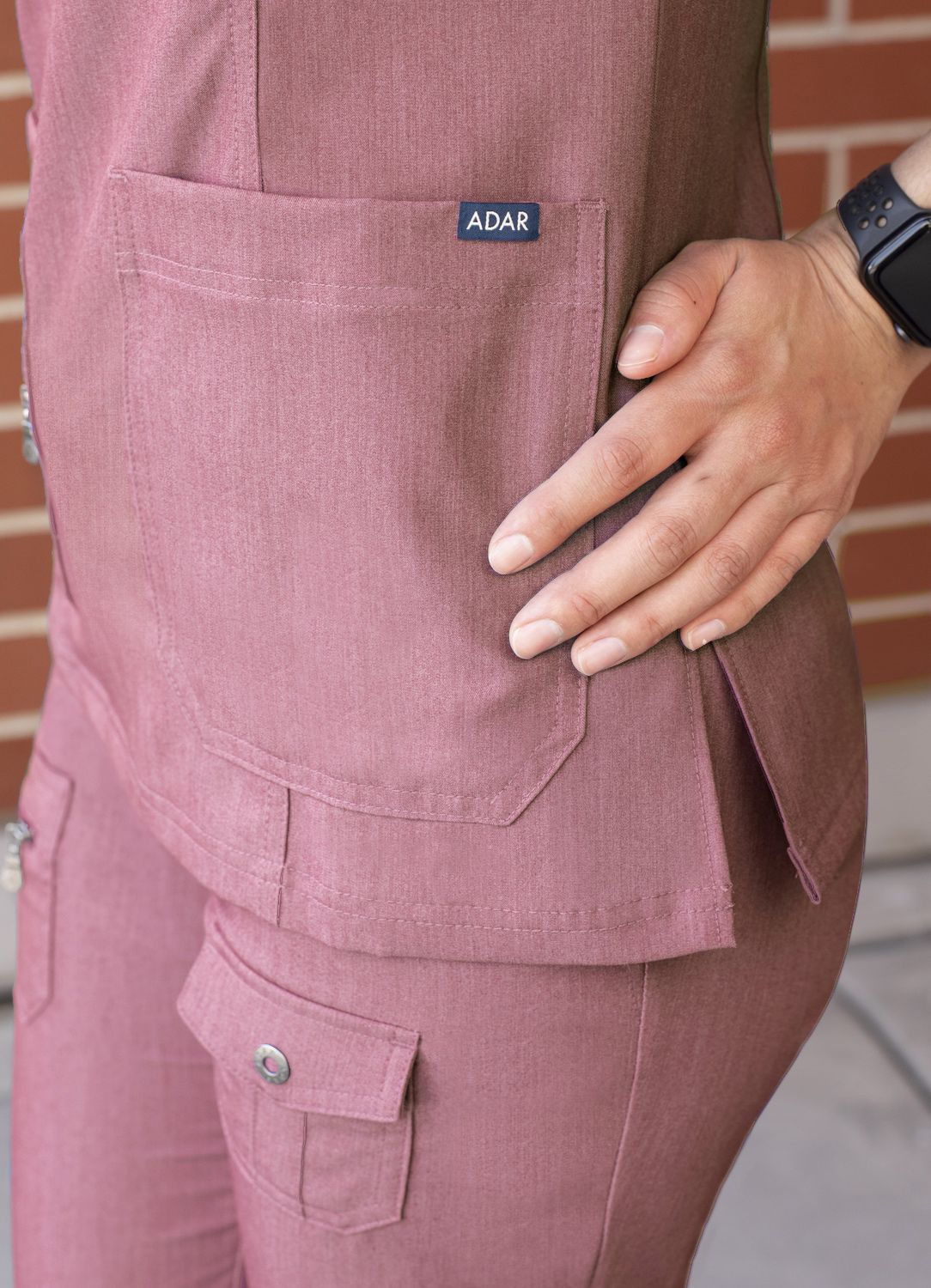 An elevated version of the classic v-neck scrub top. Beautiful details such as a double stitched neckline, back and front curved princess seams, shaped patch pockets and super soft stretch fabric truly make this scrub top a crowd favorite.Iconic Adar zipper detail adorns the front pocket. Features such as double stitching with tonal thread and odor/wrinkle resistant fabric make it just as durable as it is beautiful.