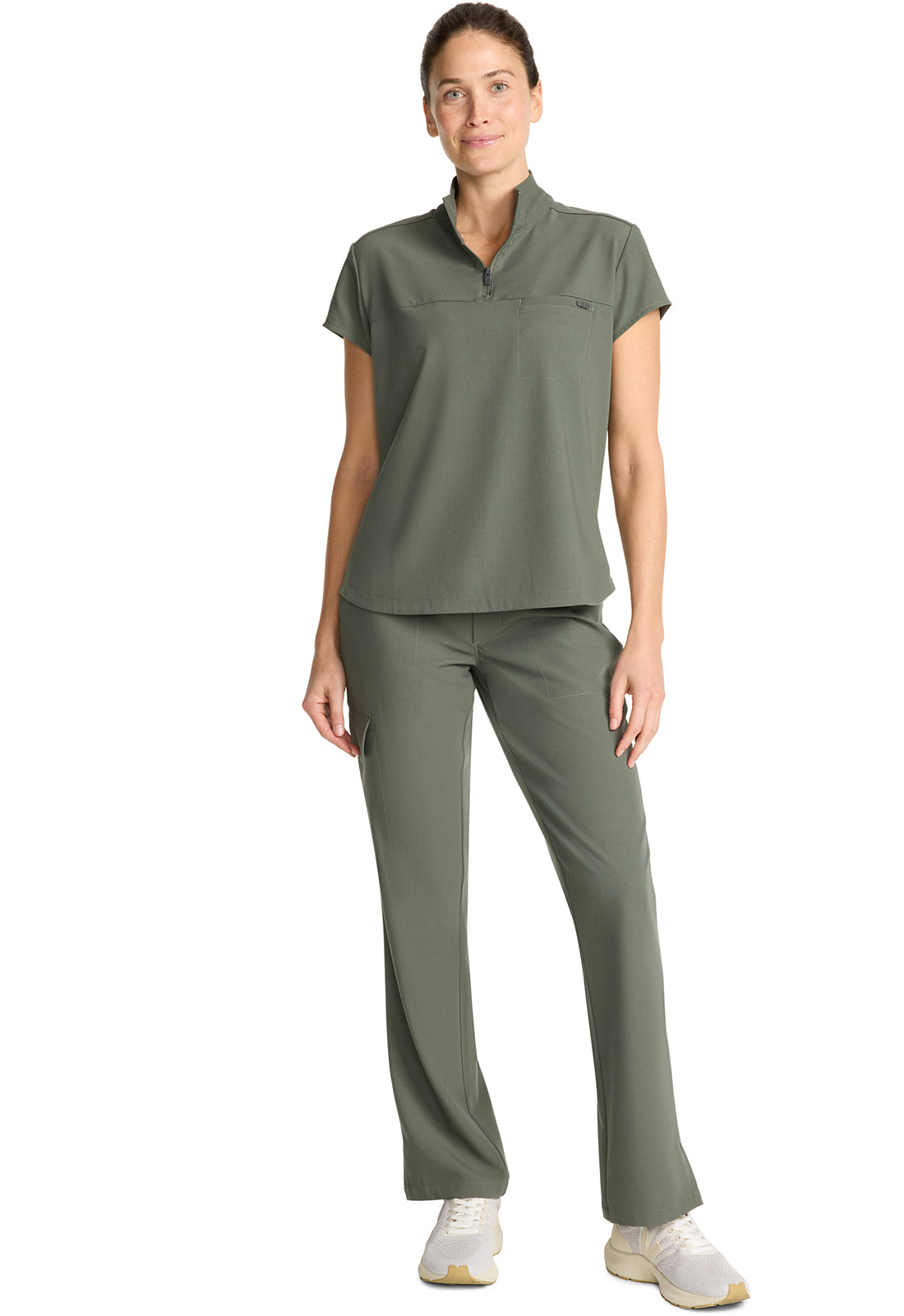 The Bella scrub top has style to spare starting with a stand-up collar and quarter zip opening with logo zipper pull. There is one welt chest pocket with a pretty printed pocket bag plus front chest seam and a curved back yoke. This scrub top is finished with an updated shirttail hem and side vents. The soft four-way stretch fabric includes moisture wicking for added comfort. Modern fit. Center back length (size Small): 25"