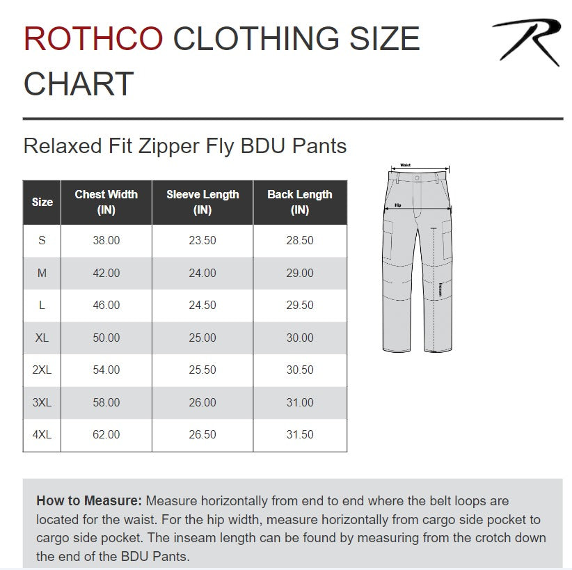Gear up with Rothco's Relaxed Fit Zipper Fly BDU Pants. Looking for a tough and comfortable pair of pants that can handle whatever you throw at them? These rugged BDU Pants are the real deal, and feature the same military look and utility as our standard BDU pants, but with a wider leg opening and zipper fly to support a relaxed fit. These tactical cargo pants offer comfortable all-day wear and adaptability.