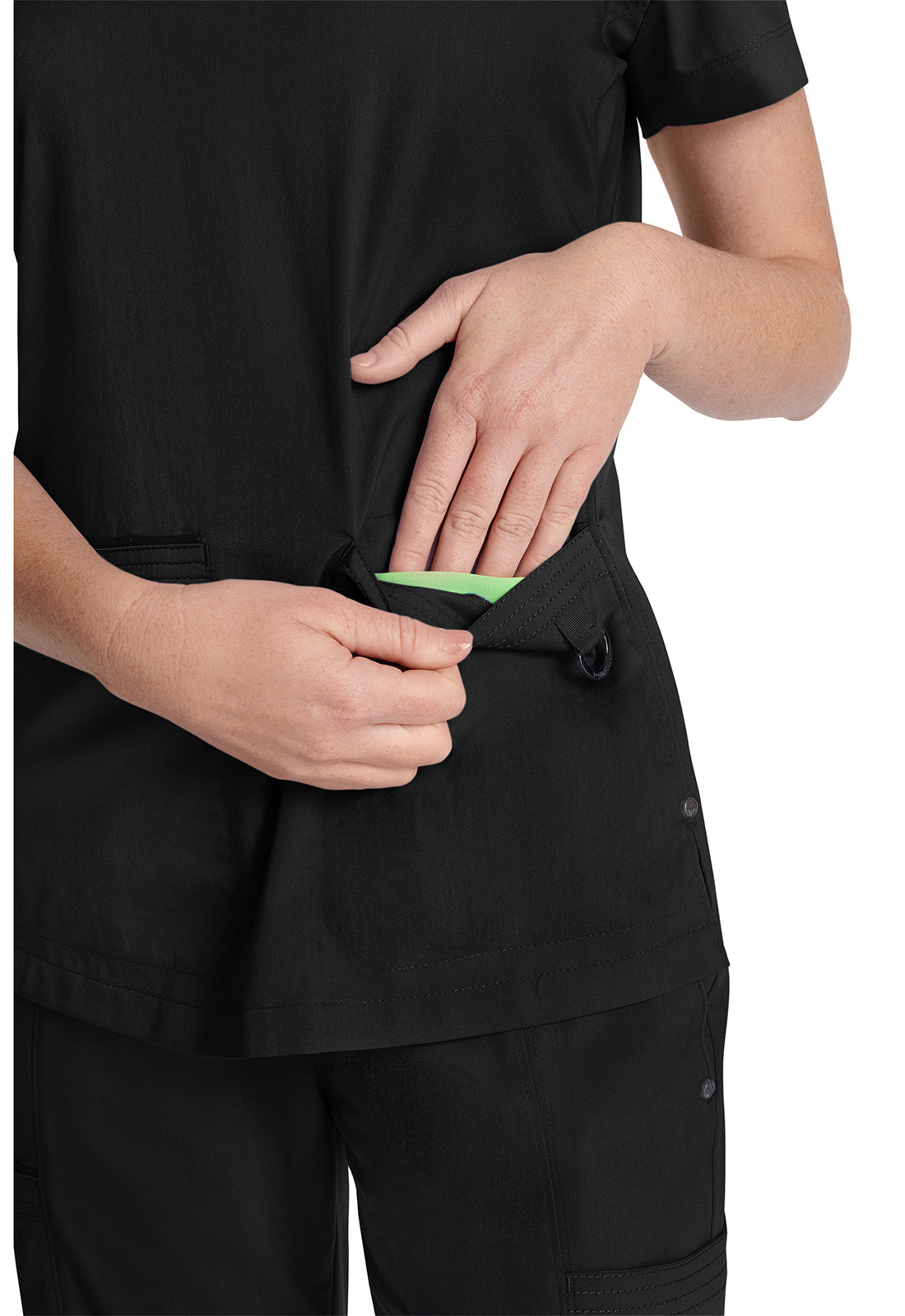 • The Purple Label Jean Top with a jewel neckline features a total of three pockets for storage: two welt pockets and an interior mesh media pocket on the wearer's left side. A D-ring is attached to the left pocket for additional storage. There are utility loops inside the wearer's right pocket. Notched sleeve hems for added style. Front and back princess seams plus back darts for fit and shaping. Dyed-to-match knit side panels add comfort and stretch. Side vents for ease of movement. Multi-needle stitching and logo grommets complete this style. Modern fit. Length: 25 1/2"