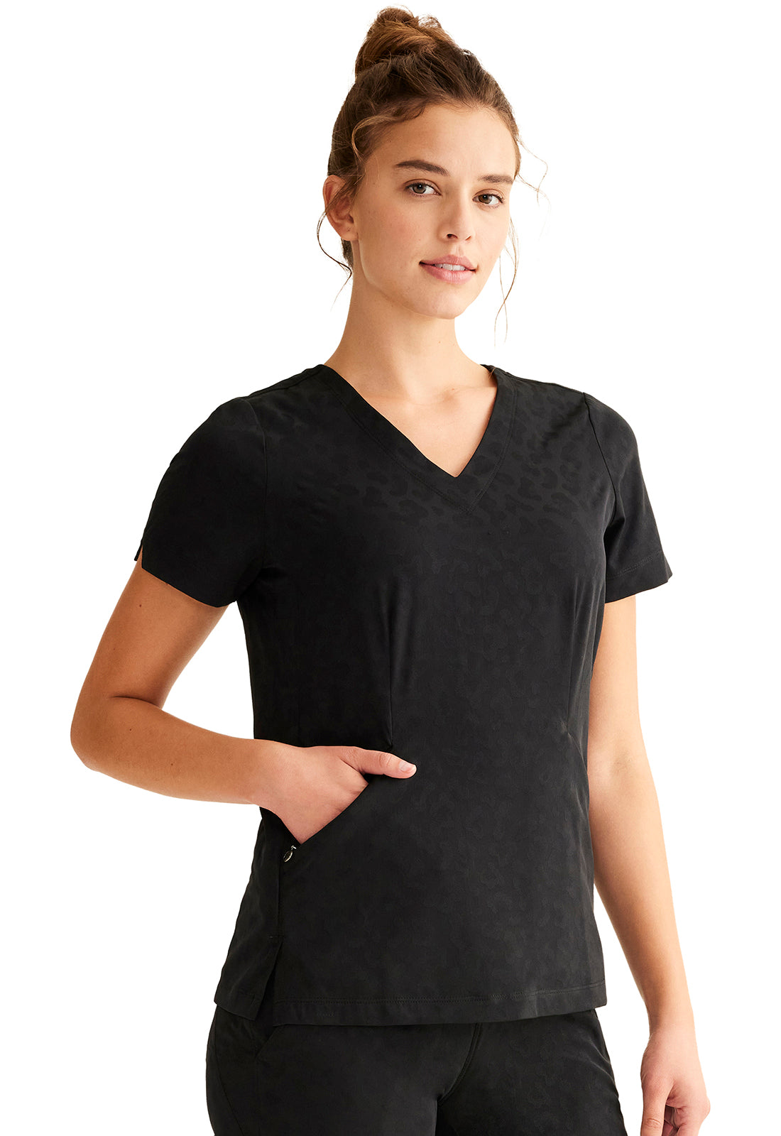 This Modern fit V-neck top has a notch on each sleeve hem for ease of movement, a back yoke seam and 2 front in-seam zip pockets. There are front and back princess seams and darts. Side vents complete the look. Center back length: 25".