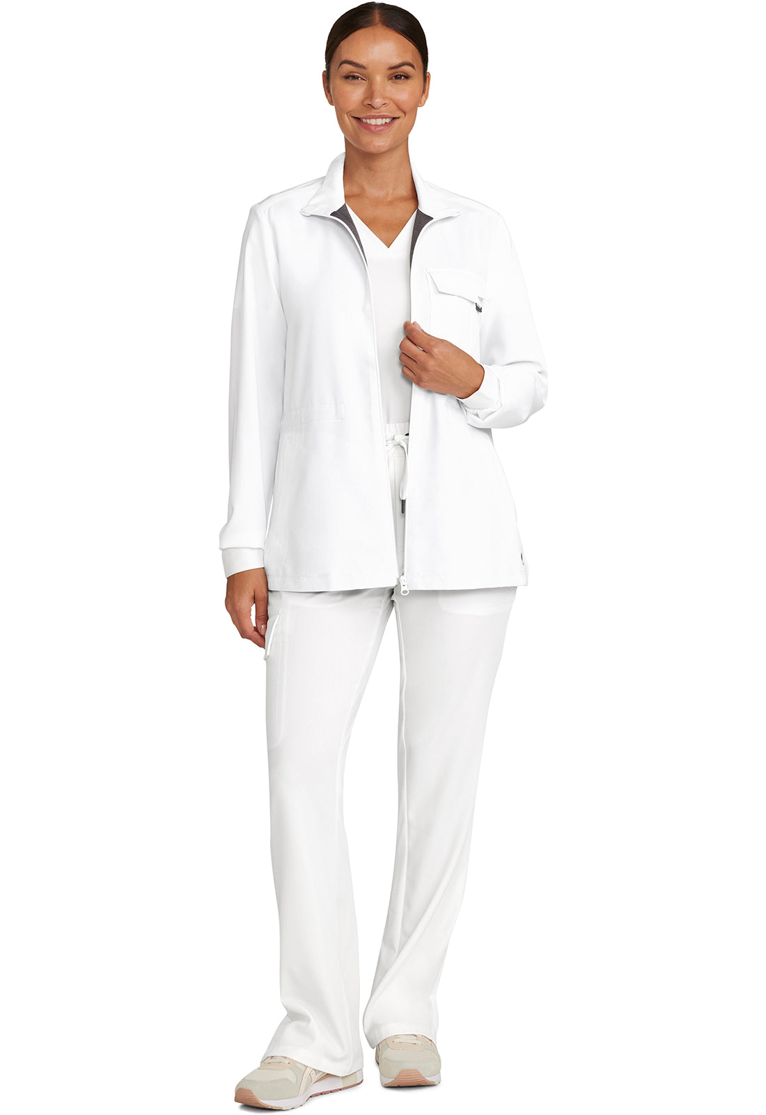 Perfect for work-to-weekend wear, the Brooks zip front jacket boasts exceptional design details. There is a logo zipper pull, stand-up collar, grosgrain ribbon trim on the shoulder seams, and patterned elastic sleeve cuffs. This utility jacket is partially lined with knit on the inside front and back yoke to guard against cool days and chilly hospitals. There are four pockets for stylish storage: one pintucked chest pocket with flap and logo D-ring, two front welt pockets, and one cell pocket on the inside left. Exterior pockets have pretty printed pocket bags. Adjust the waist using the bungee cord and toggles for a customizable fit. The curved back yoke provides a better fit across the shoulders. Side vents at hem for ease of movement. The soft four-way stretch fabric includes moisture wicking for added comfort. Modern fit. Center back length (size Small): 26"