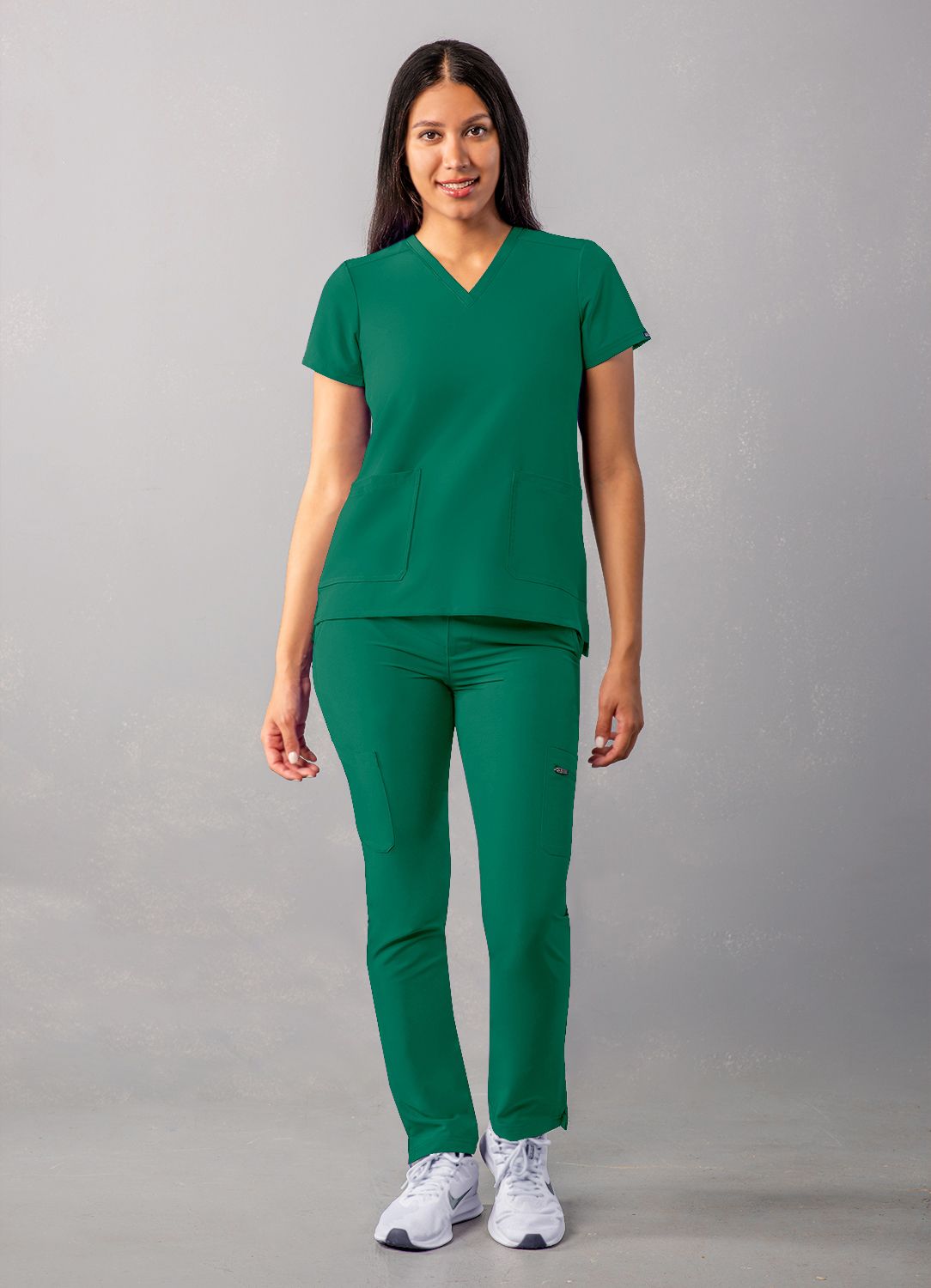 Modern yet simple, this contemporary fit V-neck top features two front patch pockets, with extra tech storage internal pocket on the right, side vents for easy movement and a high/low hem for full coverage. The back darts at the center back gives this top it’s slimming shape while the enhanced details such as the forward shoulder and back yoke and ADAR brand icon on the back gives this style a modern look. This scrub top is a must-have addition to your workwear.