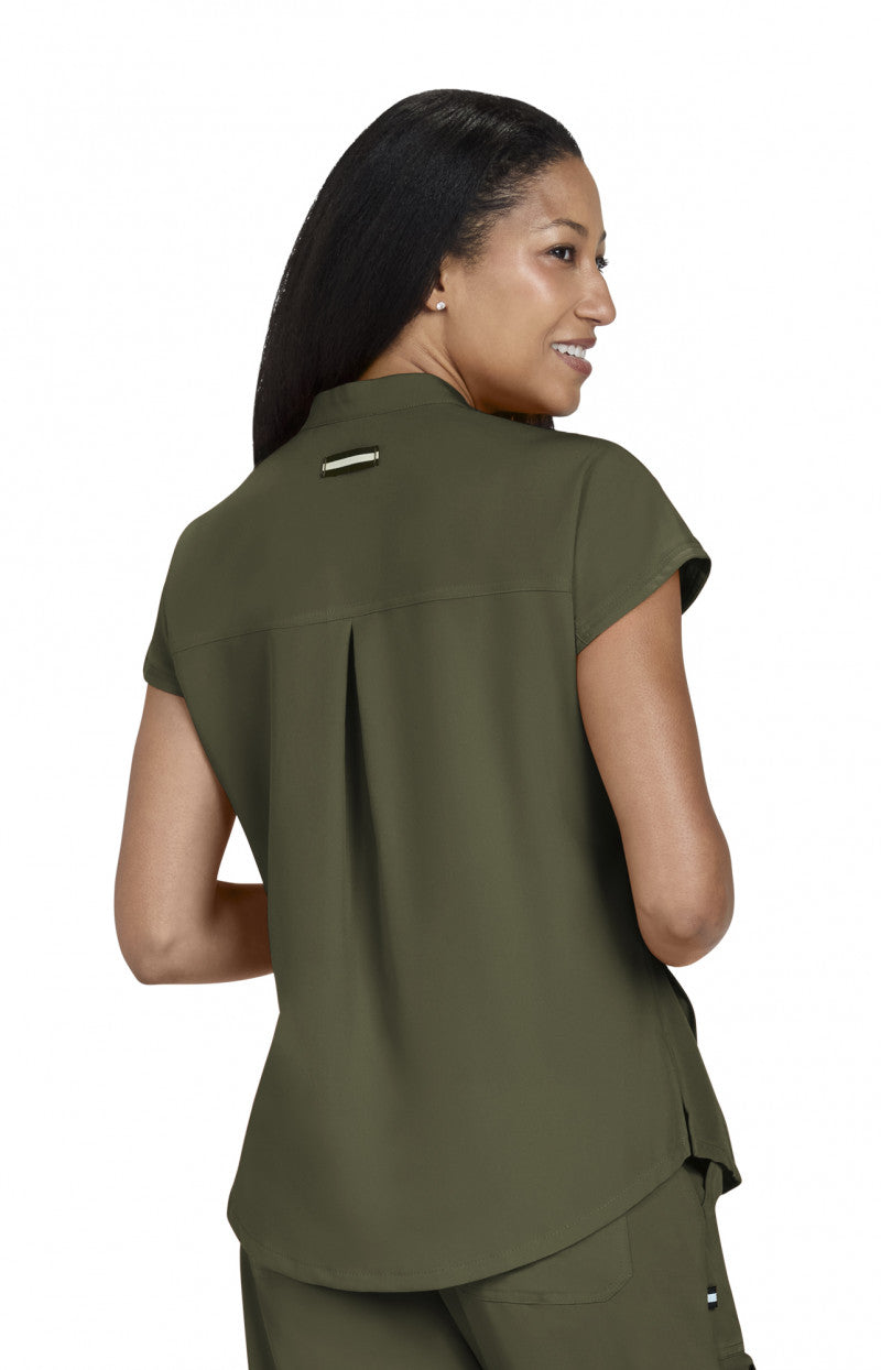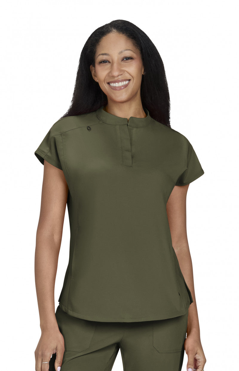 Take on the day with this sleek, modern women's scrub top designed to power you through even the busiest shifts. Featuring a high neck collar with a hidden button closure, dolman cap sleeves, ID badge loop ,and 2 front inseam pockets to keep your essentials close at hand. Made with our signature koi Next Gen 4-way stretch fabric, it features a soft brushed finish and advanced moisture-wicking that keeps you cool, calm, and collected even under pressure. Contemporary fit.