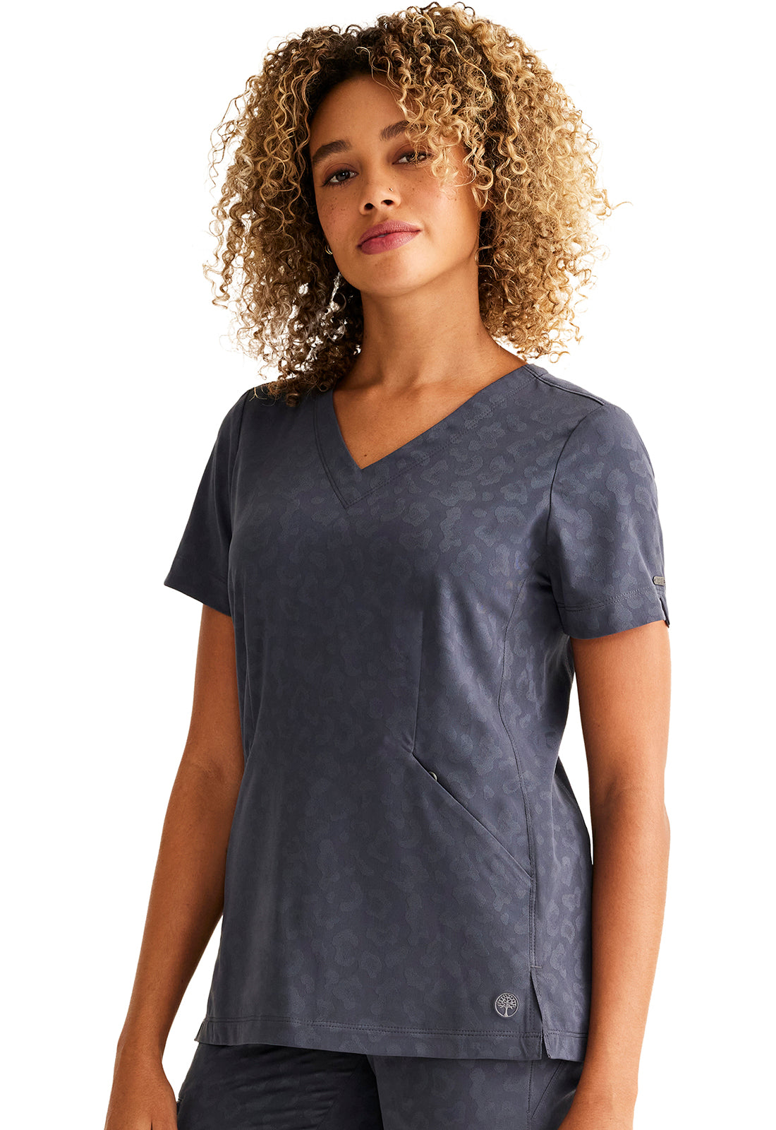 This Modern fit V-neck top has a notch on each sleeve hem for ease of movement, a back yoke seam and 2 front in-seam zip pockets. There are front and back princess seams and darts. Side vents complete the look. Center back length: 25".