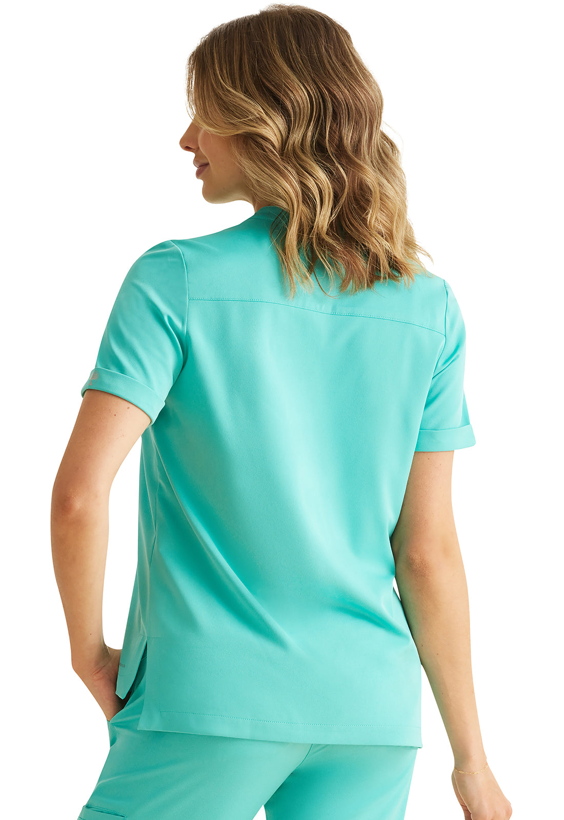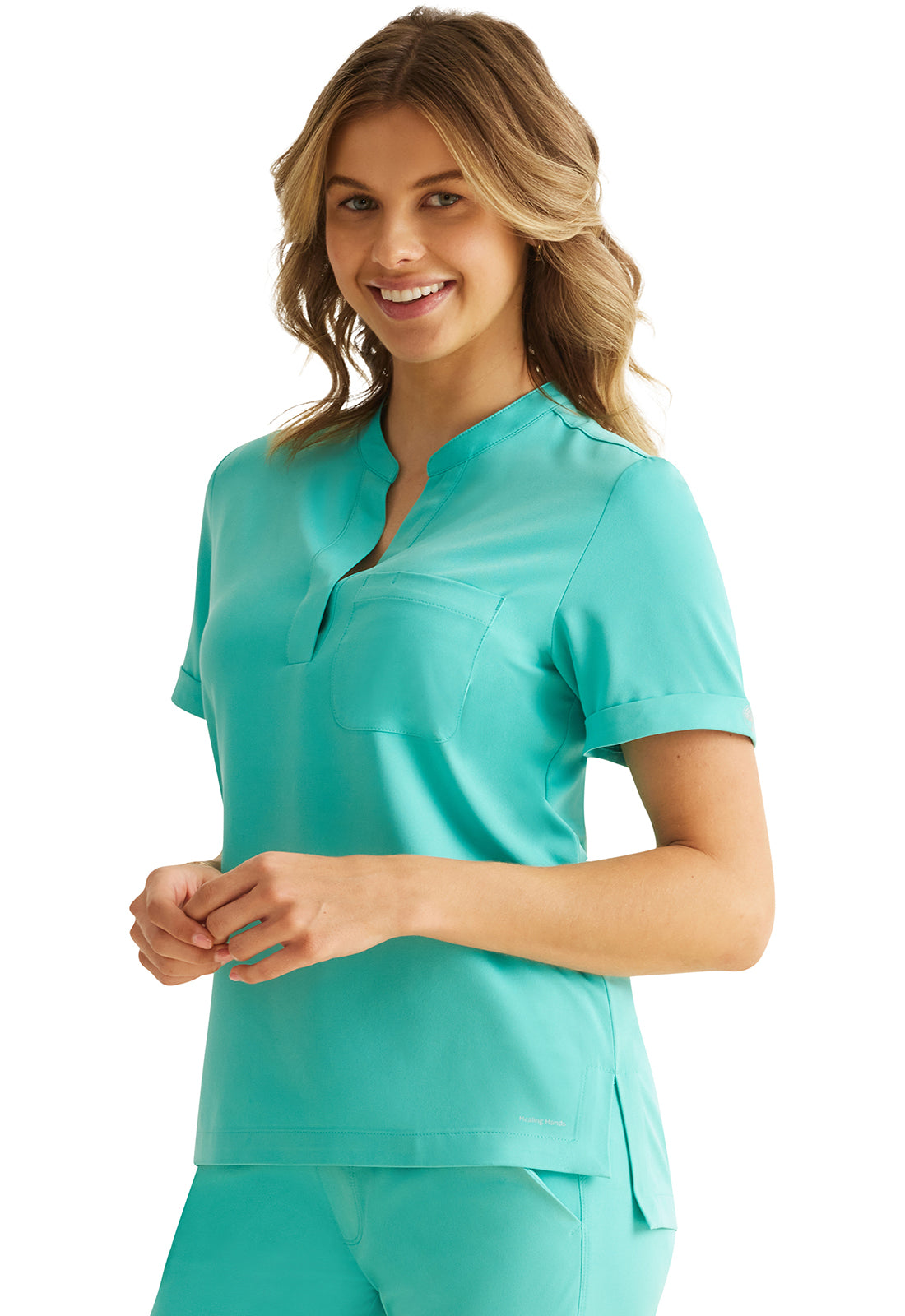 • This Macy Top is crafted with the ideal blend of soft yet durable fabric. It features 1 chest pocket and a stylish Mandarin collar with a half placket. The high-low hem and side vents allow for ease of movement, while the French cuffs and Modern fit create a flattering silhouette. Center back length: 25".