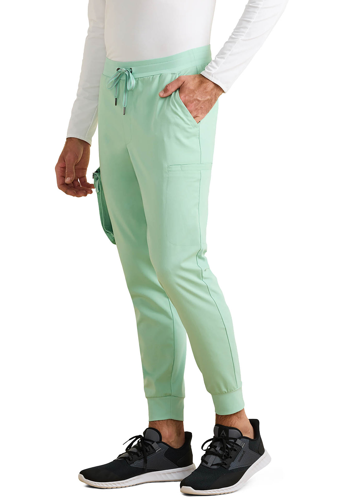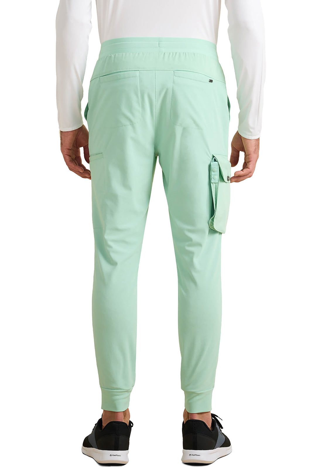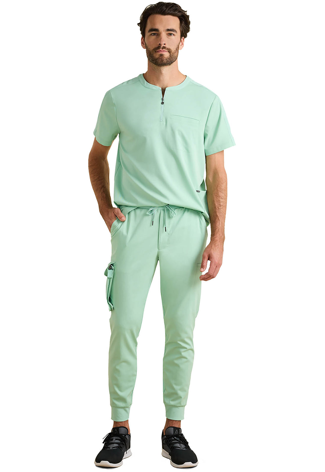 Soft woven scrub fabric on the front plus a stretchy full knit back equals one very stylish Men's scrub jogger. This pant also has a unique detail: a detachable pocket for on-the-go storage. The Healing Hands x Dr. Kwane Men's Vernon mid rise zip fly scrub jogger features an elasticized waistband with a drawstring for adjustability and security. There are seven pockets for organized storage: two front slant pockets, two welt cargo pockets, and two back welt pockets. Detachable pocket on wearer's right side converts into a bag. A back yoke provides a better fit. The mixed media design continues with dyed-to-match knit back panels and knit cuffs. Modern fit. Tapered jogger leg, 10" leg opening. Inseam: 29"