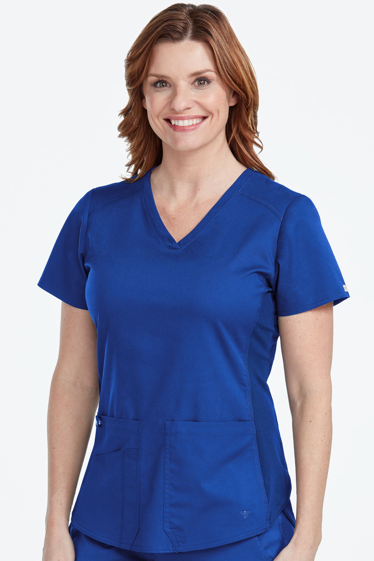 • Designed to fit and flatter all body shapes and sizes, this scrub top is everything you want in scrubs and more. A simple silhouette is enhanced with the addition of a classic shirttail hem. Rib knit side panels add comfort and ease of movement, while their overlapping design adds sporty flair.
