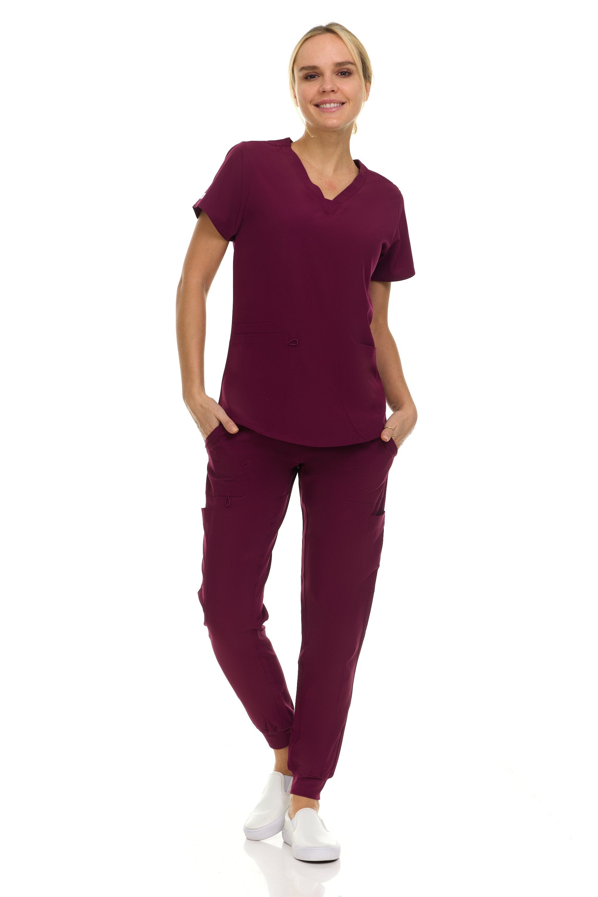 Hey Uniforms- Renee Ribbed V-Neck Top & Knit Jogger Scrub Pant XS-3XL / Wine