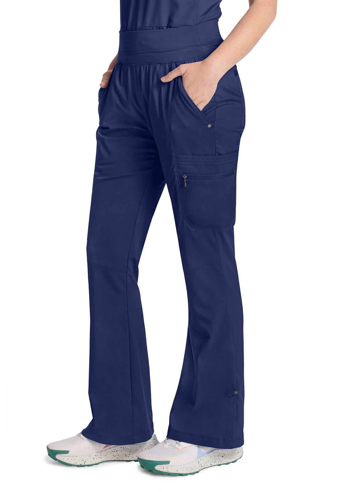 The Tina Pant is a Modern fit bootcut pant featuring a high rise pull-on yoga knit waistband. There are 8 pockets for organized storage: 2 front slant pockets, 1 front zipper pocket, 2 cargo pockets with multi-needle stitching (right with hidden instrument loops), 1 zip cargo pocket with Healing Hands logo zipper pull, and 2 back welt pockets. Knee seams and logo grommets add visual interest. Side vents at hem. Leg opening: 19". Inseam: 32 ½"