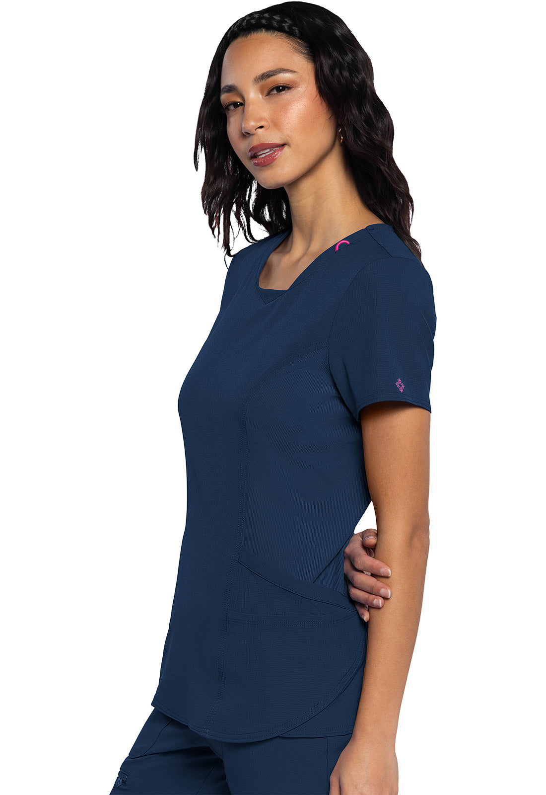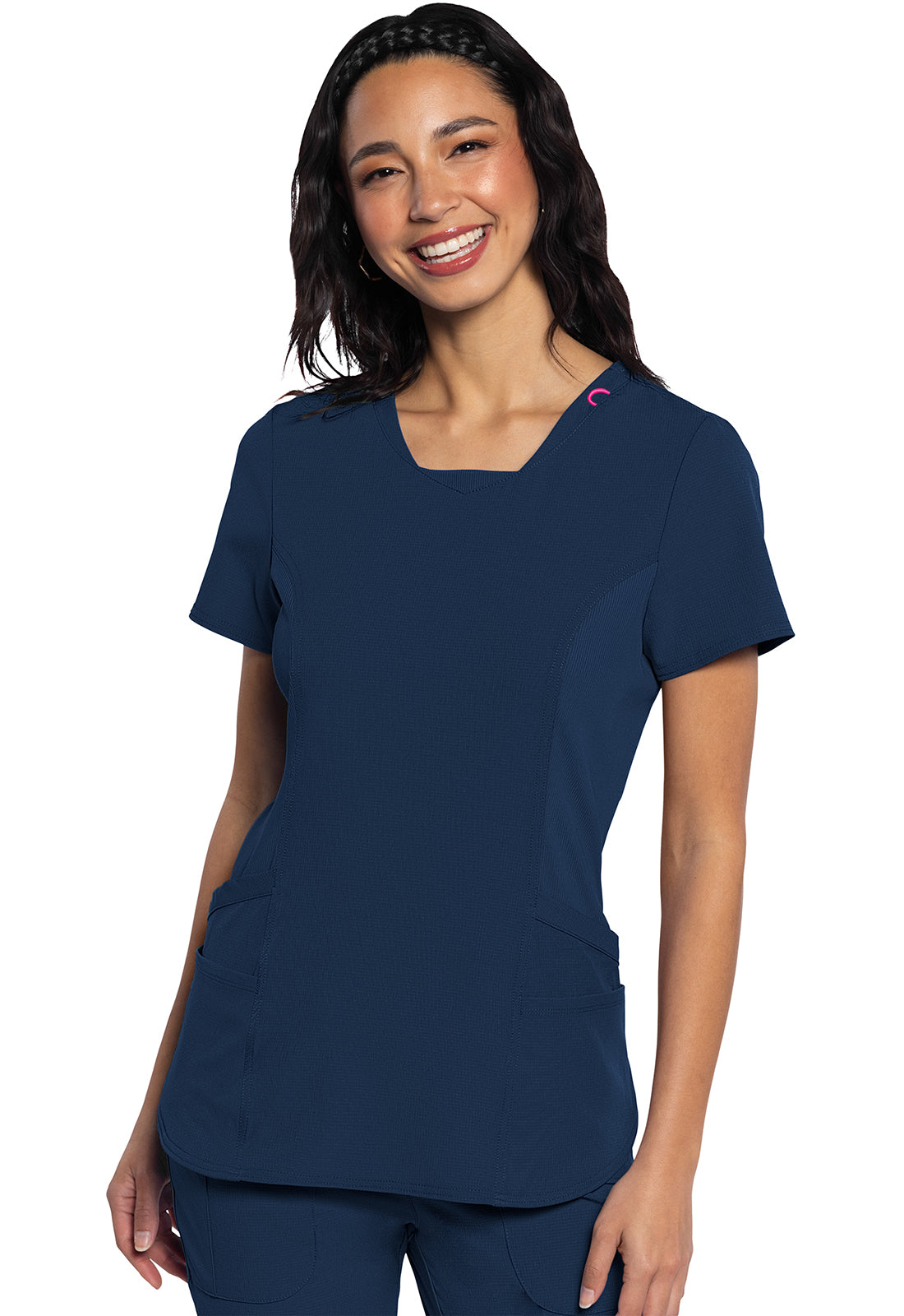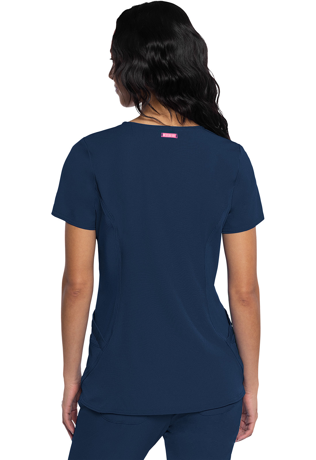A fashionable update to a uniform favorite, this Med Couture Missy fit v-neck top features a stylized neckline with a dyed-to-match rib-knit inset. There is also a bungee ID badge loop at the neckline on the wearer's left side. Four pockets create organized storage with double patch pockets on each side. Front and back princess seams add shape and fit. Dyed-to match rib-knit side panels provide comfort and stretch while the cut-out vents at the hem add style and ease of movement. Locker loop at center back neck. Cap sleeves complete the look. Center back length: 26"