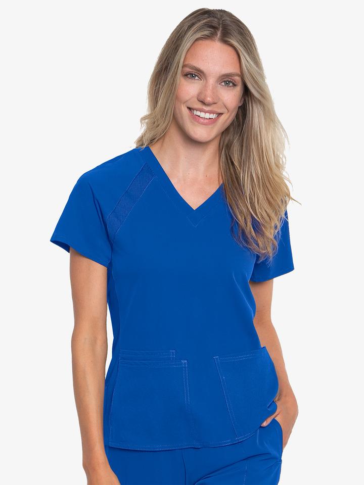 Med Couture has gone super sporty with this minimalistic V-neck top. Beautiful rib knit accents punctuate a flattering silhouette.
