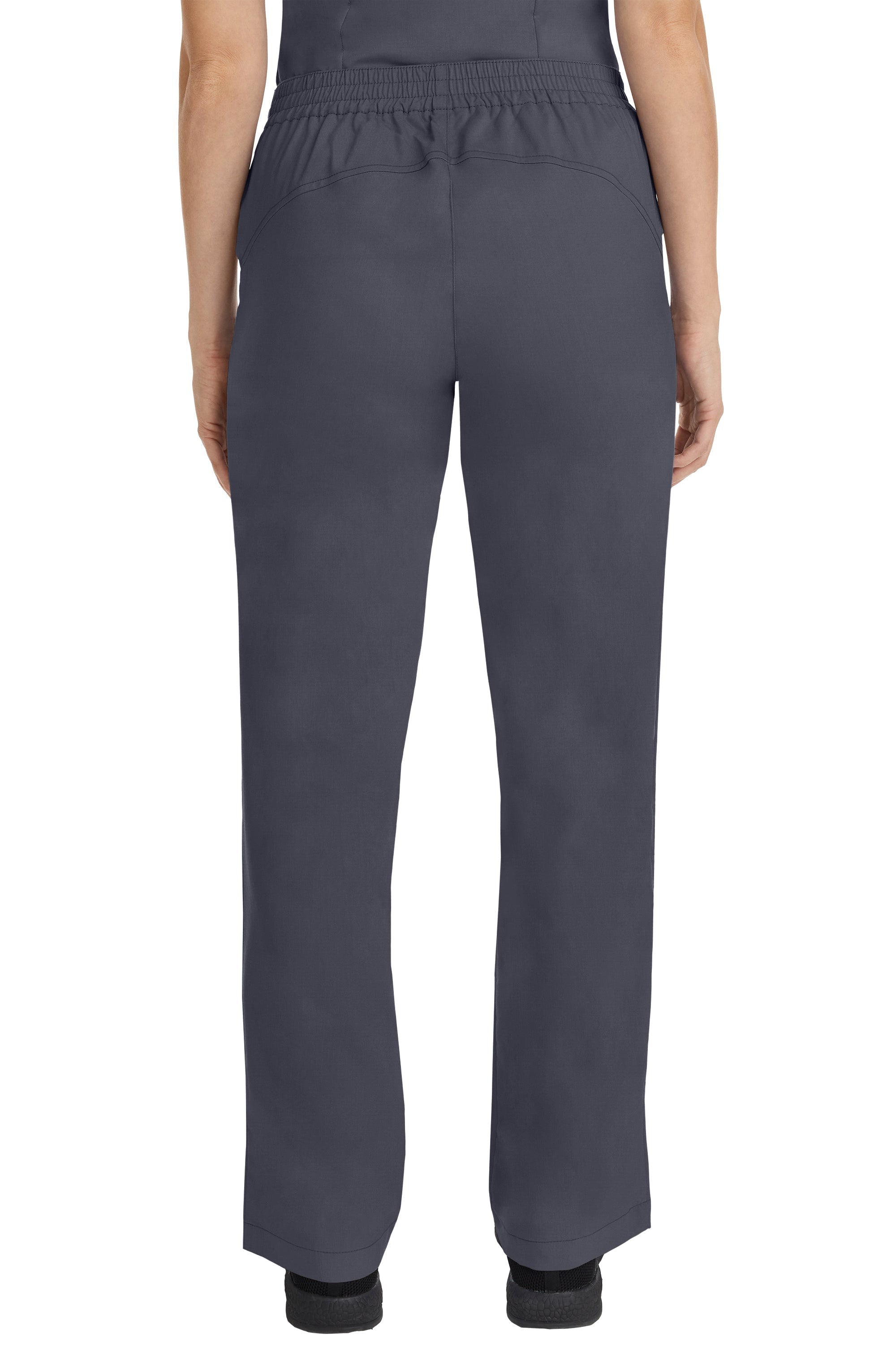 77% Poly/20% Rayon/3% Spandex Flat front Pant grommet detail on drawstring 2 front pockets, back yoke elastic detail