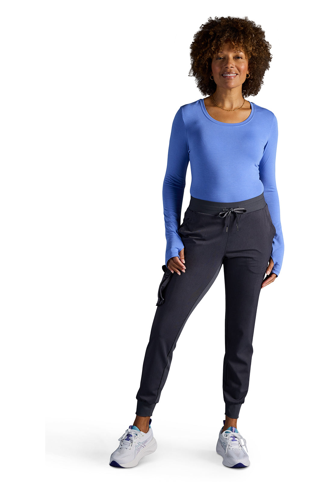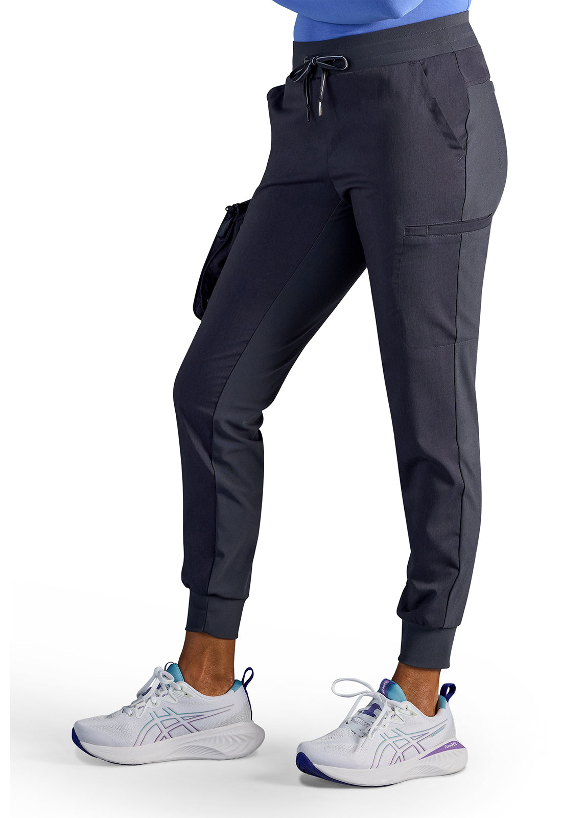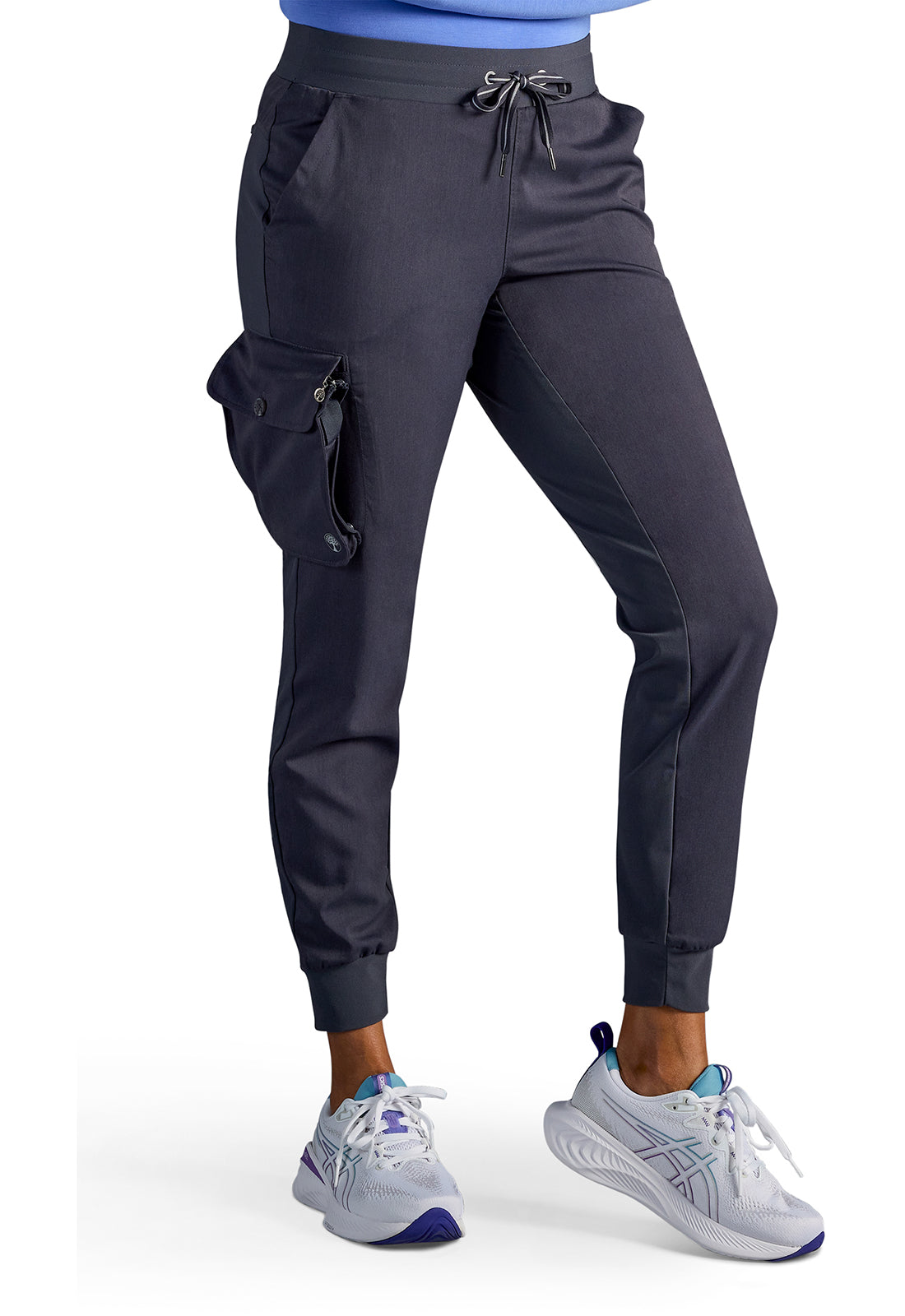 Soft woven scrub fabric on the front plus a stretchy full knit back equals one very fashionable scrub jogger. This pant also has a unique detail: a detachable pocket for on-the-go storage. The Healing Hands x Dr. Kwane Vanessa mid rise scrub jogger features a mock fly plus an elasticized waistband with a drawstring for adjustability and security. There are seven pockets for organized storage: two front slant pockets, two welt cargo pockets, and two back welt pockets. Detachable pocket on wearer's right side converts into a bag. A back yoke provides a better fit. The mixed media styling continues with dyed-to-match knit back panels and knit cuffs. Modern fit. Tapered jogger leg, 8 3/4" leg opening. Inseam: 28 1/2"