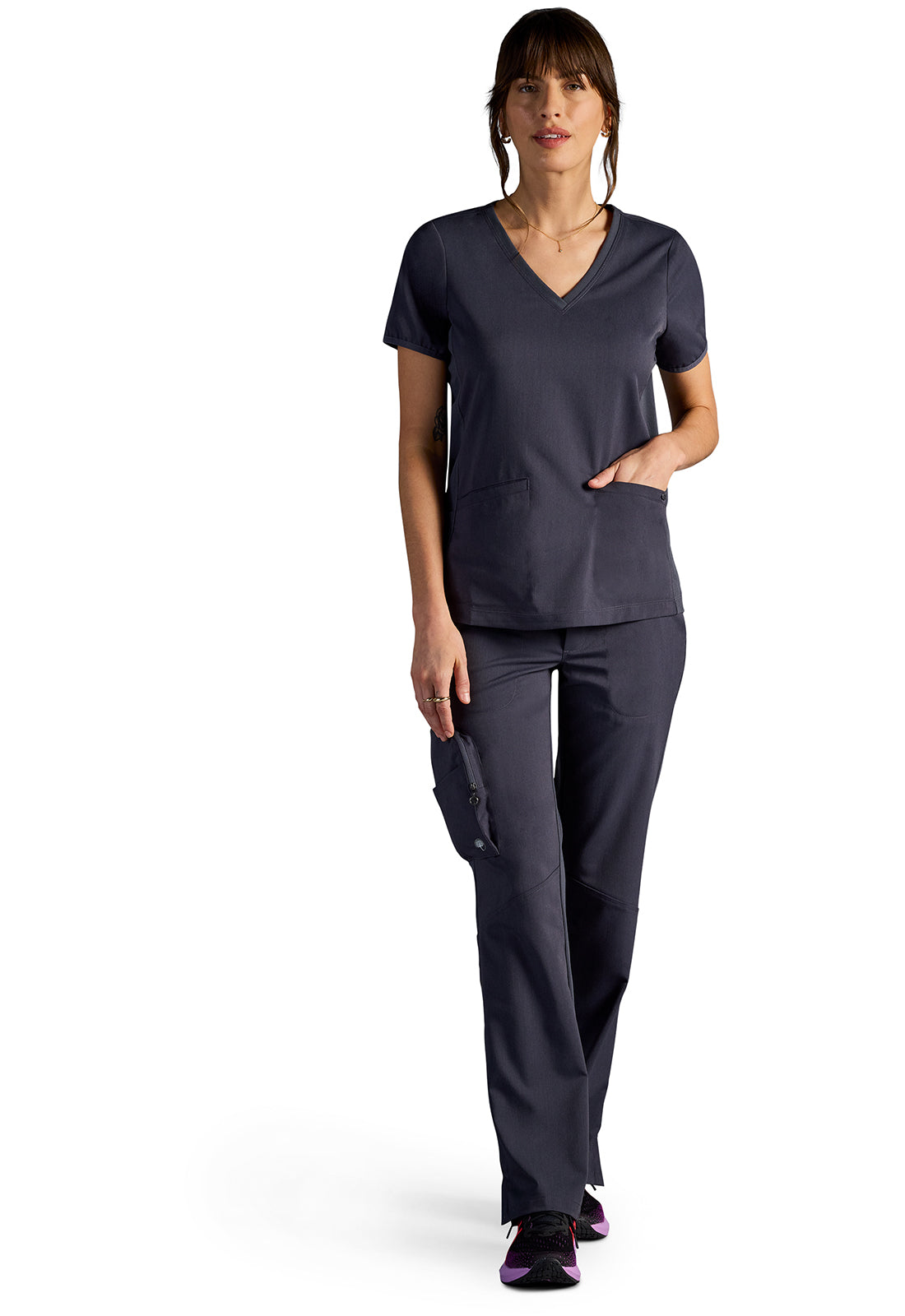 • Comfort and style combine in the Vivian v-neck top from Healing Hands x Dr. Kwane. Dyed-to-match knit trim on neck band plus stylish and stretchy dyed-to-match knit side panels. There are four pockets for organized storage: two welt pockets, one hidden media pocket on the wearer's left side, and one right hip pocket. Hidden media pocket includes dyed-to-match knit trim at top of pocket. Sleeve hems are finished with elasticized cuffs. Front and back princess seams for fit and shaping. Back darts provided added fit while back vents provide ease of movement. Modern fit. Center back length: 25"