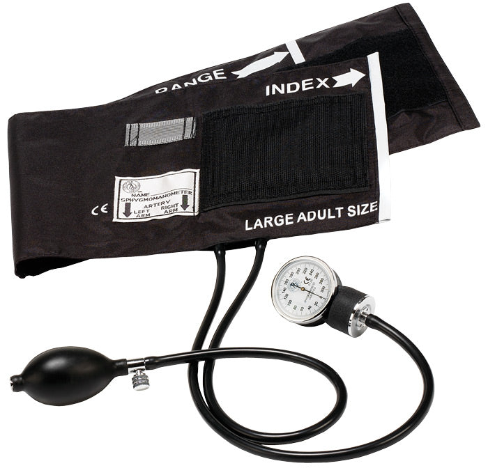 Features: Latex free, nylon cuff, Index and Range Markings, artery indicator mark, owner ID label, gauge holder, standard inflation bulb and air release valve