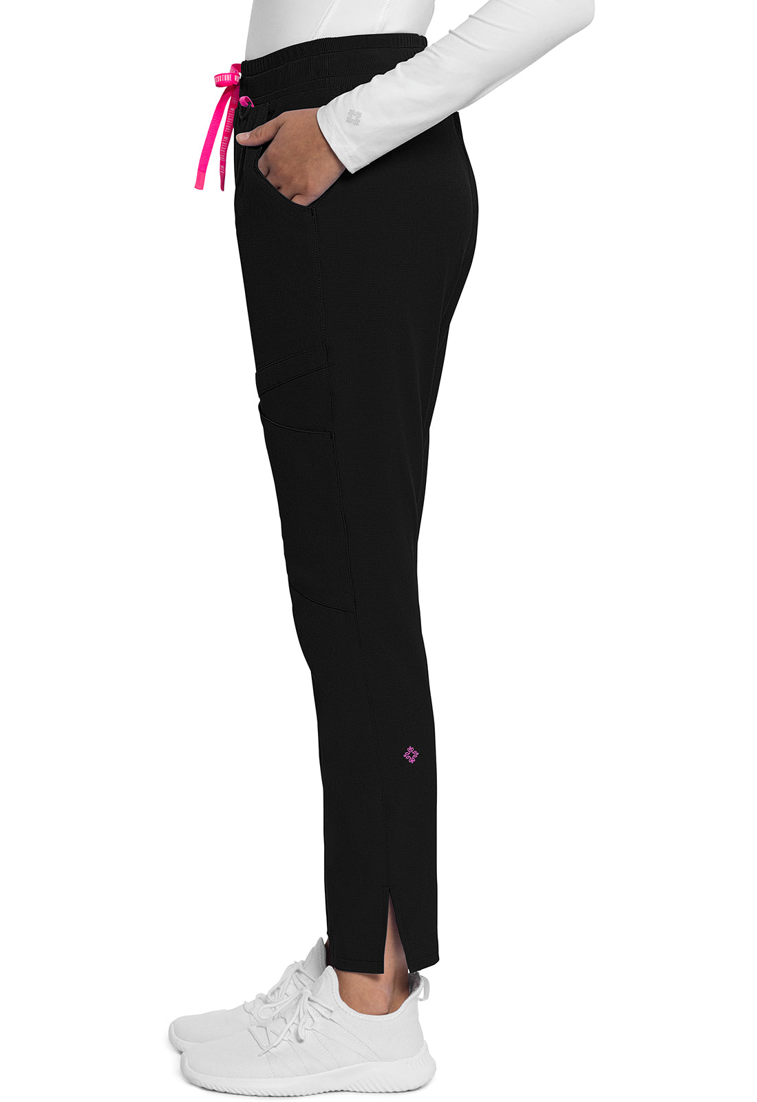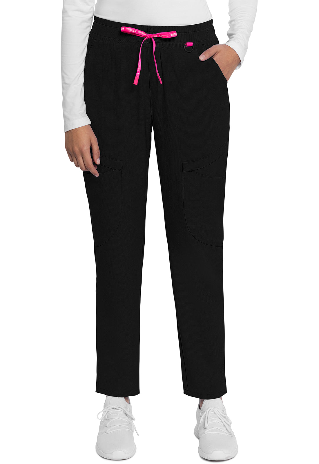 Modernized cargo pockets are sure to please on this Missy fit mid rise pant. The rib-knit covered elastic-reinforced waistband features a signature color logo drawstring for security and adjustability. There is a d-ring attached to the waistband at the wearer's left side. Four pockets provide organized storage: two front scoop pockets and two stylized cargo pockets. The side seam and curved back yoke are one continuous seam for shape and fit. Side vents at hem. Tapered leg, 13" opening. Inseam: 29 ½".