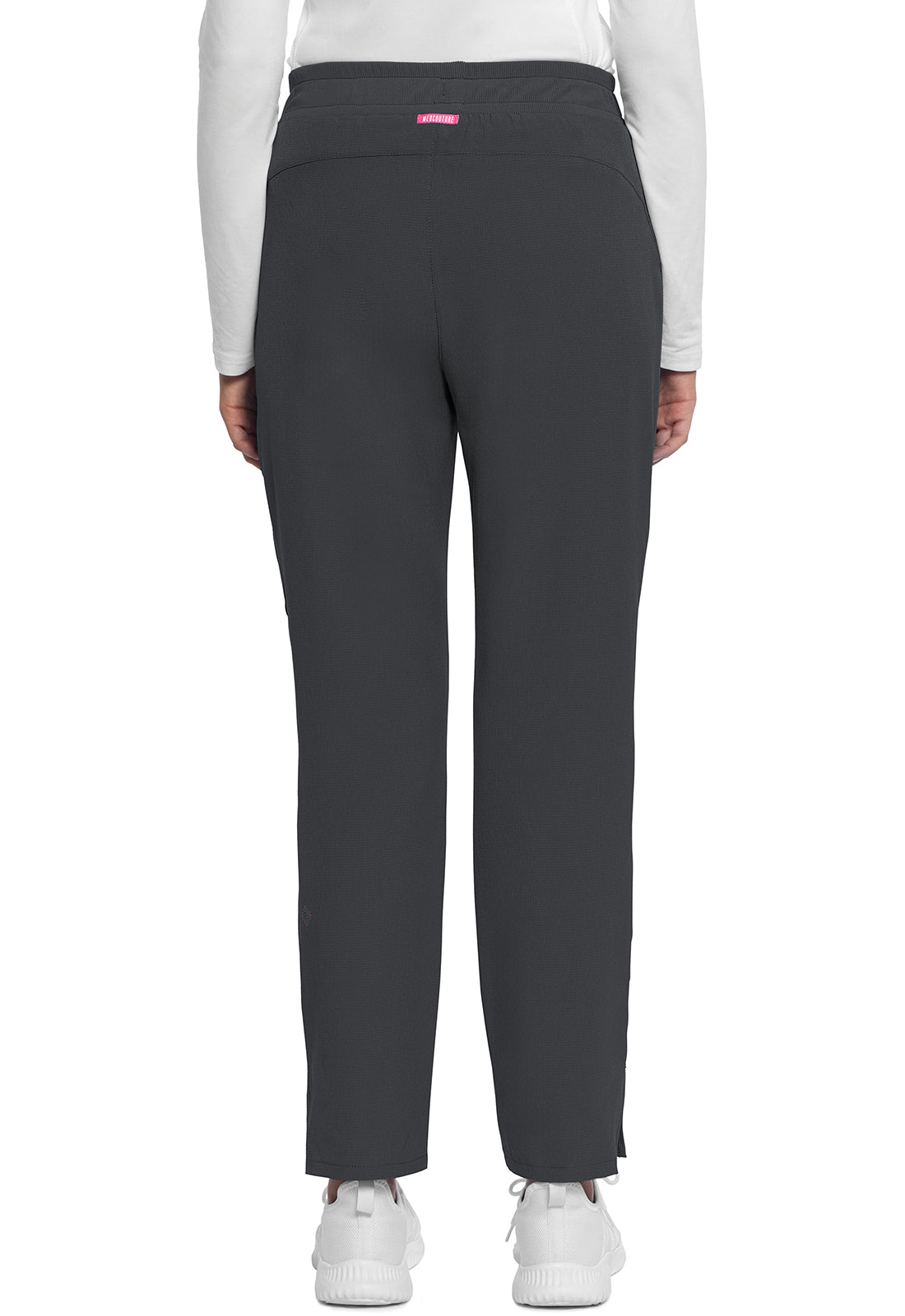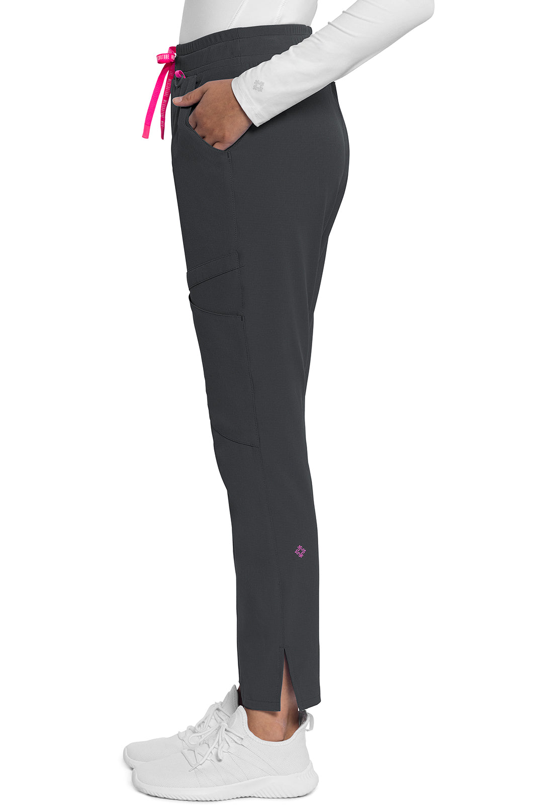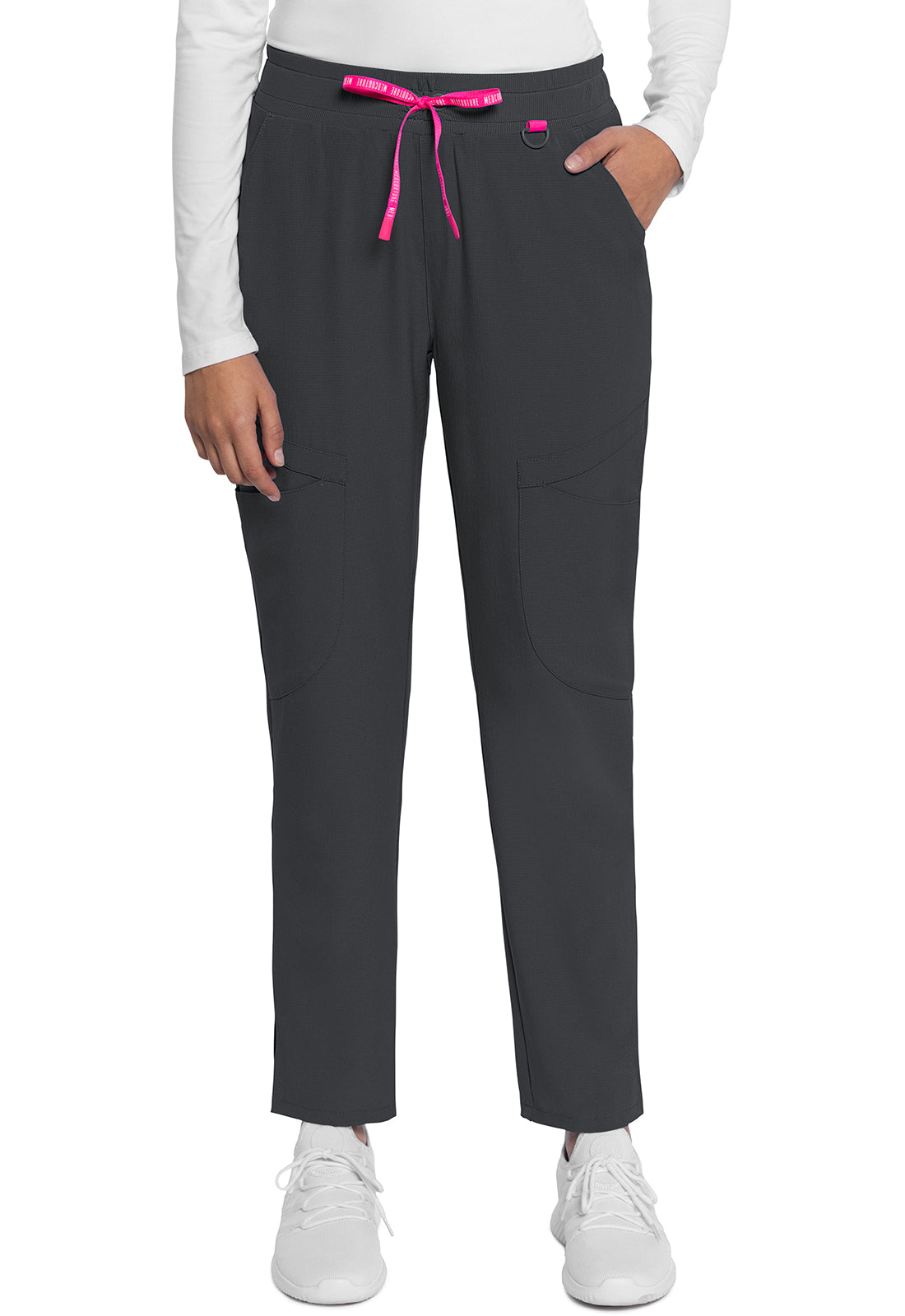 Modernized cargo pockets are sure to please on this Missy fit mid rise pant. The rib-knit covered elastic-reinforced waistband features a signature color logo drawstring for security and adjustability. There is a d-ring attached to the waistband at the wearer's left side. Four pockets provide organized storage: two front scoop pockets and two stylized cargo pockets. The side seam and curved back yoke are one continuous seam for shape and fit. Side vents at hem. Tapered leg, 13" opening. Inseam: 29 ½".