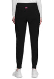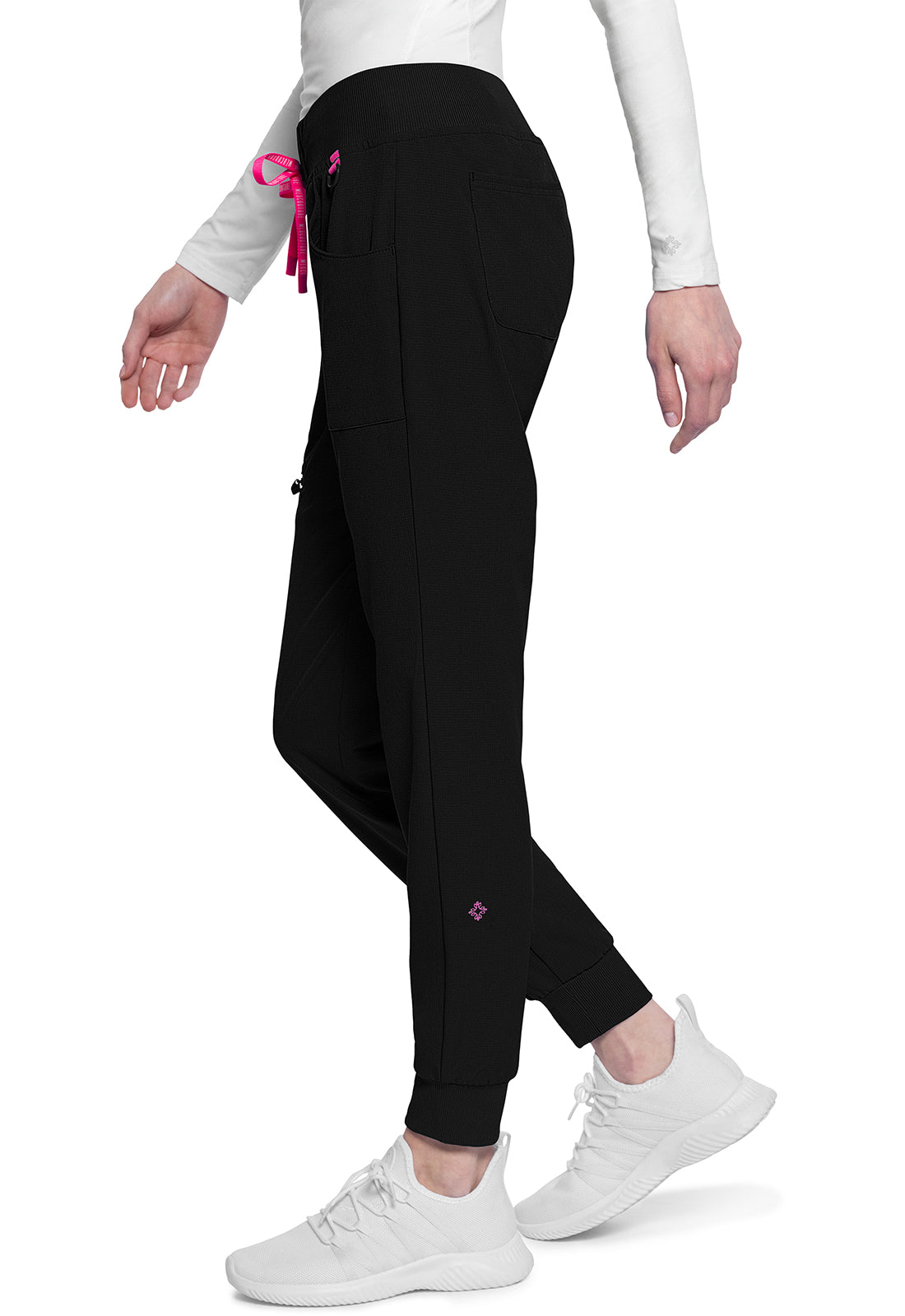 This Missy fit mid rise jogger features a rib-knit covered elastic reinforced waistband with signature color logo drawstring. There is a d-ring at the waistband and a locker loop at the center back waist. There are five pockets for organized storage: two front pockets (right with pen/instrument slot), one zipper cargo pocket, and two back patch pockets. Dyed-to-match rib-knit cuffs complete this jogger pant. Tapered jogger leg, 8 5/8" leg opening. Inseam: 29"