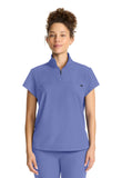 The Bella scrub top has style to spare starting with a stand-up collar and quarter zip opening with logo zipper pull. There is one welt chest pocket with a pretty printed pocket bag plus front chest seam and a curved back yoke. This scrub top is finished with an updated shirttail hem and side vents. The soft four-way stretch fabric includes moisture wicking for added comfort. Modern fit. Center back length (size Small): 25"