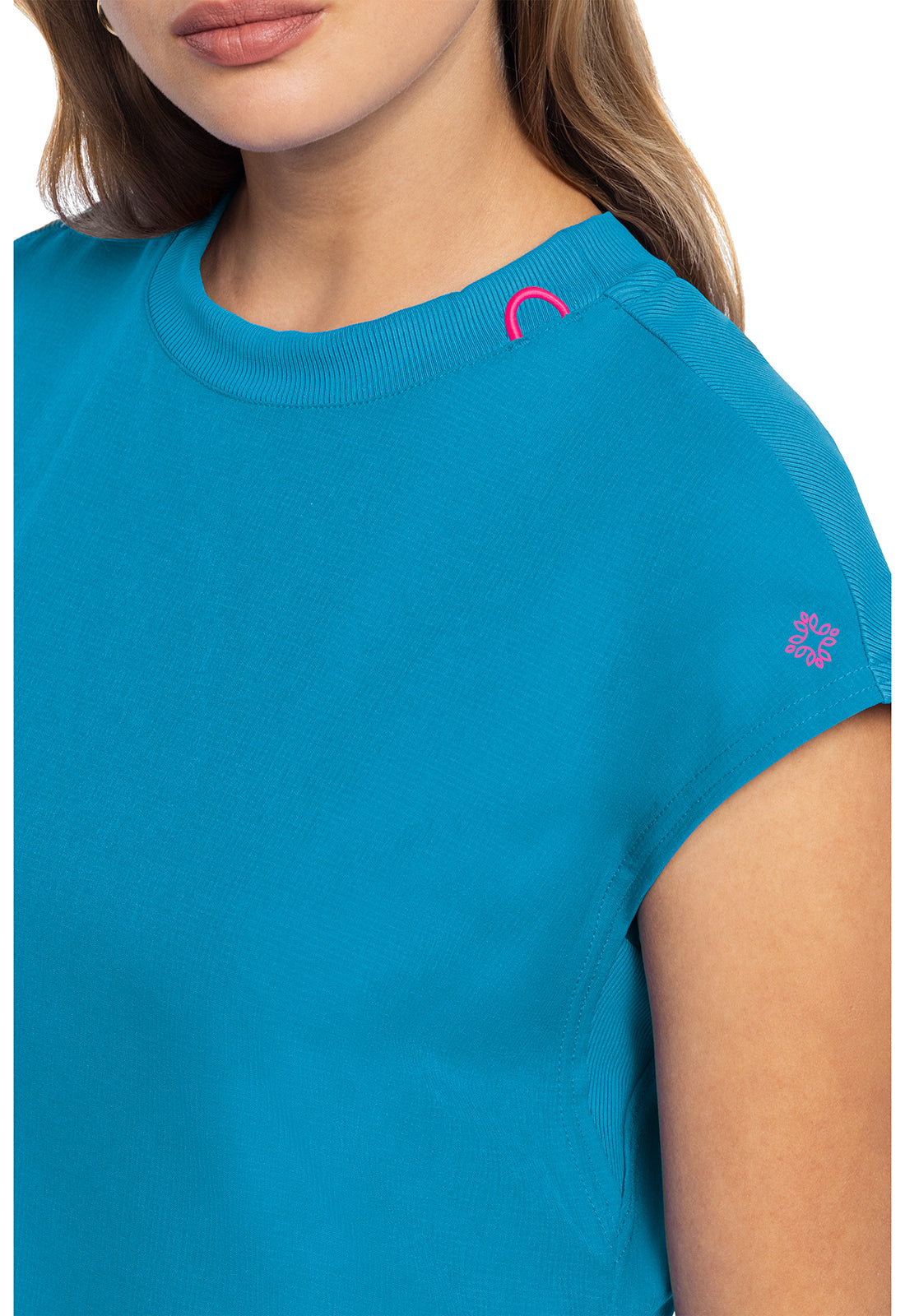 Trend alert: this Missy fit round neck tuckable top is filled with fashionable details such as dyed-to-match rib-knit neckband trim plus dolman sleeves with rib-knit insets at the armholes. There is also a bungee ID badge loop on the wearer's left side of the neckband. There are two zipper pockets for secure storage: one wireless earbuds pocket at shoulder seam and one side seam pocket on the wearer's left side. The dyed-to-match rib-knit back yoke provides style and fit. A locker loop is placed below the back yoke for quick hanging. A rounded hem completes the look. Cent back length: 25"