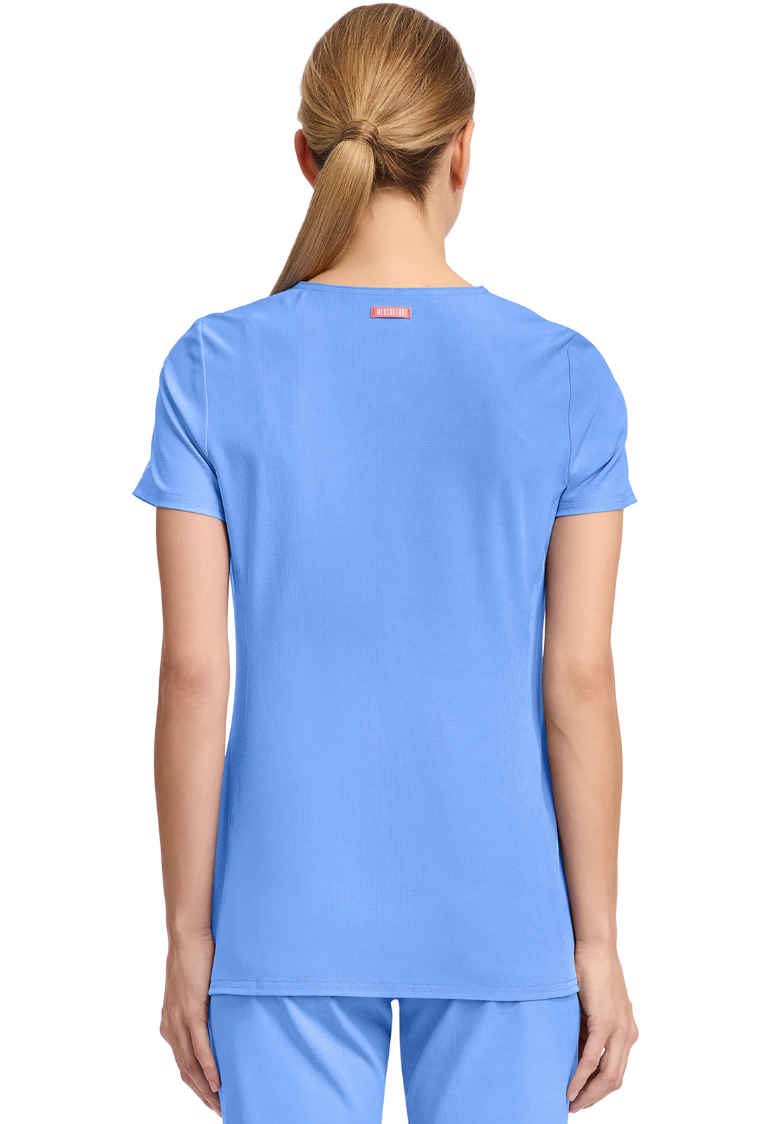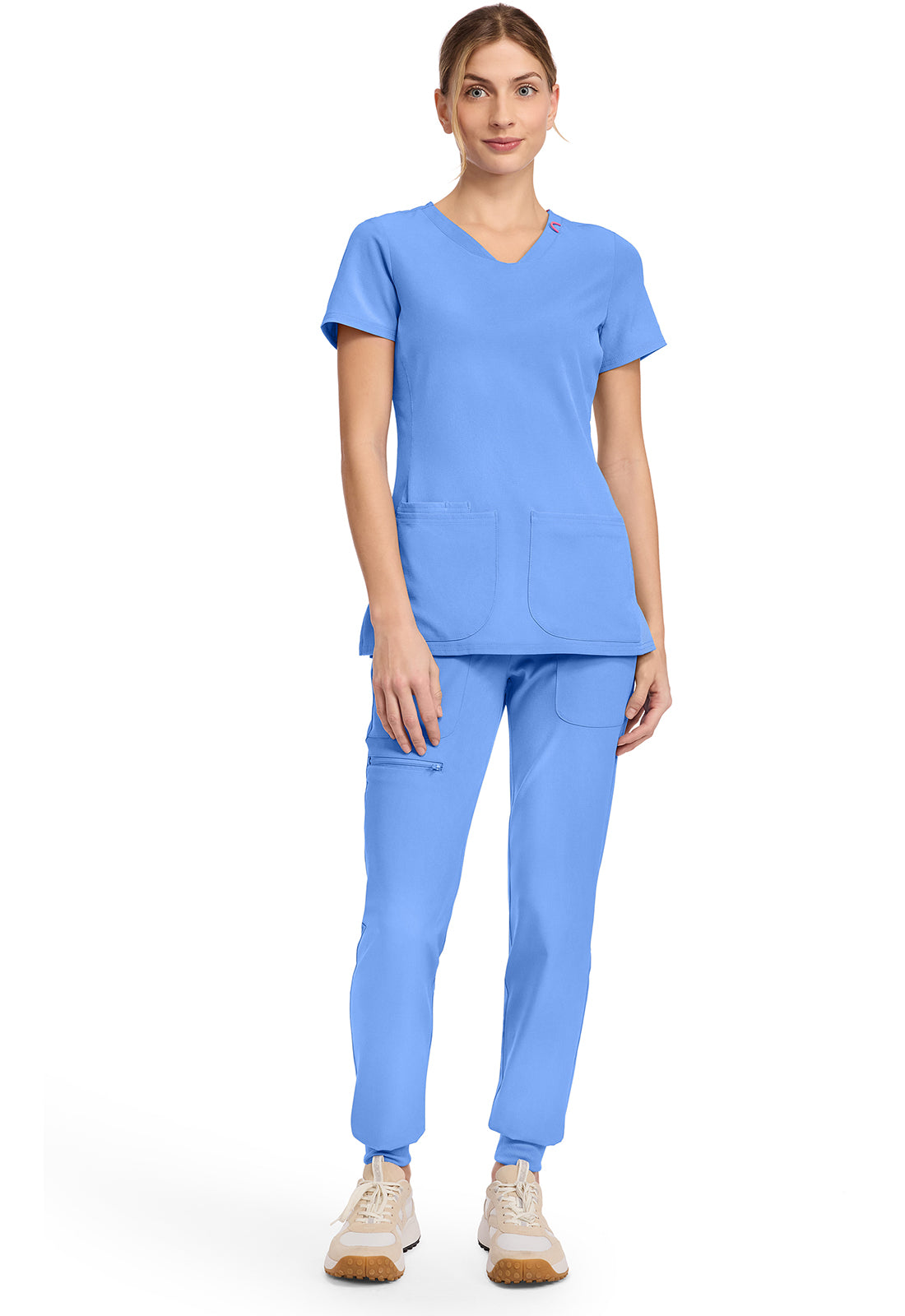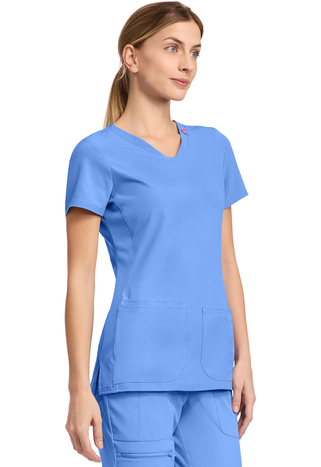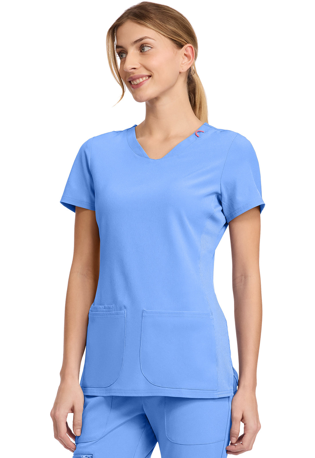 This Missy fit V-neck top has a shaped neckline with a bungee ID badge loop on the wearer's left side. There are three pockets for storage: two patch pockets plus an additional cell phone pocket with bar tacked pen slot. Twill tape instrument loops inside the wearer's right pocket for additional storage. Front and back princess seams add fit and shaping while dyed-to-match rib-knit side panels provide comfort and stretch. A rounded hem and side vents complete the look. Center back length: 25 ½"