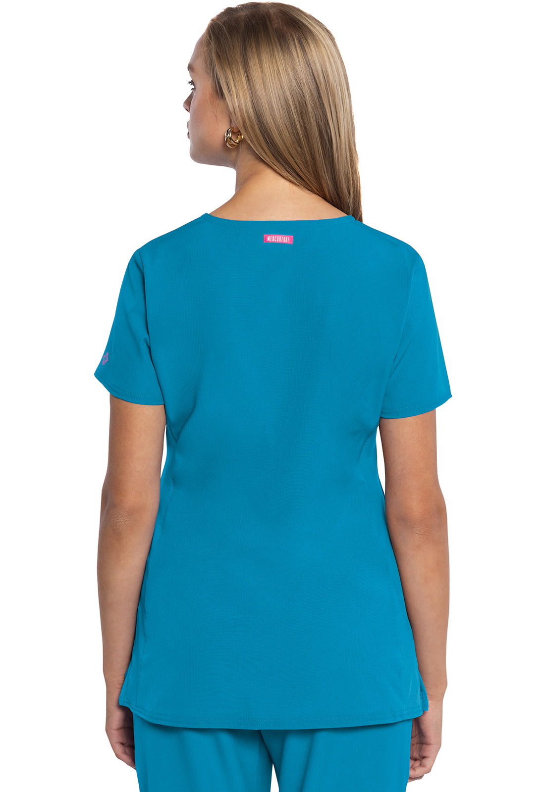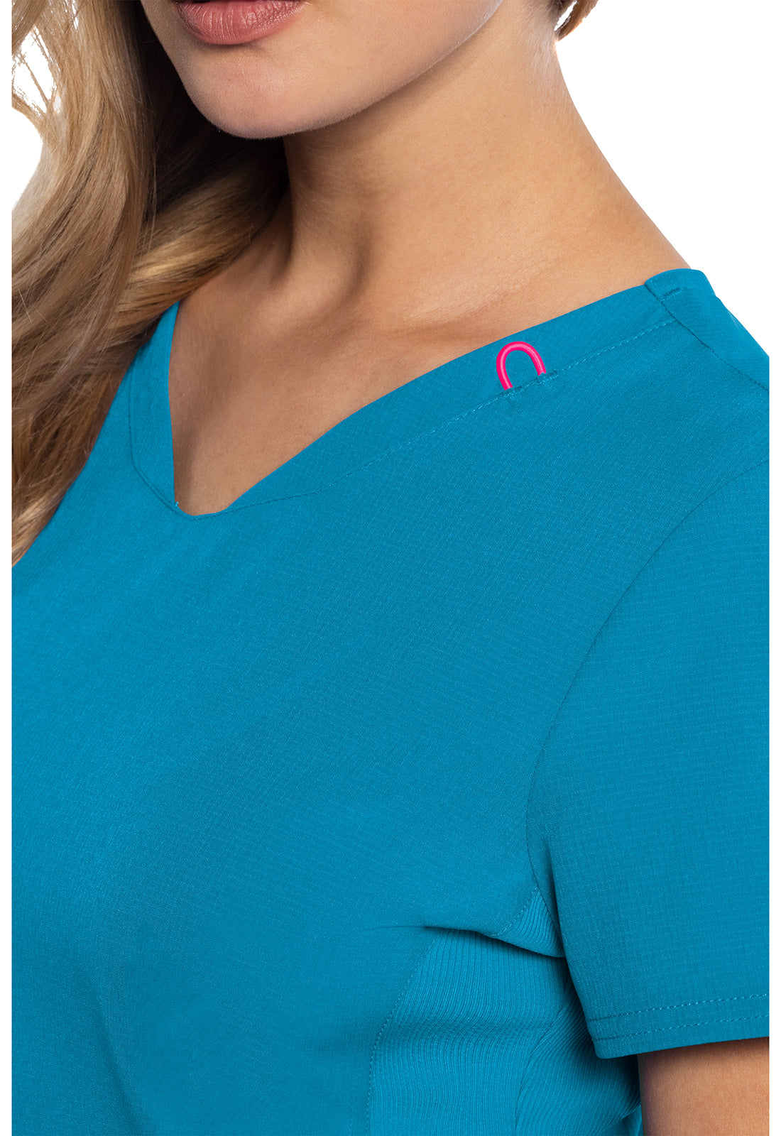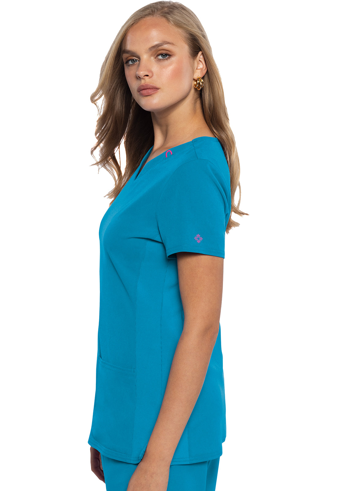 This Missy fit V-neck top has a shaped neckline with a bungee ID badge loop on the wearer's left side. There are three pockets for storage: two patch pockets plus an additional cell phone pocket with bar tacked pen slot. Twill tape instrument loops inside the wearer's right pocket for additional storage. Front and back princess seams add fit and shaping while dyed-to-match rib-knit side panels provide comfort and stretch. A rounded hem and side vents complete the look. Center back length: 25 ½"