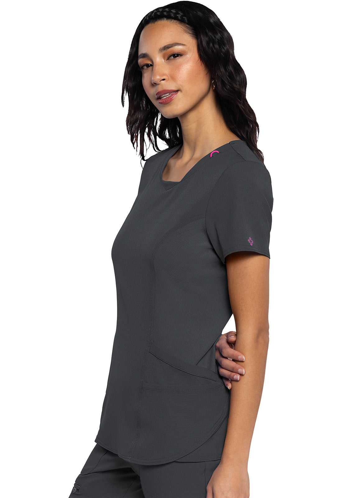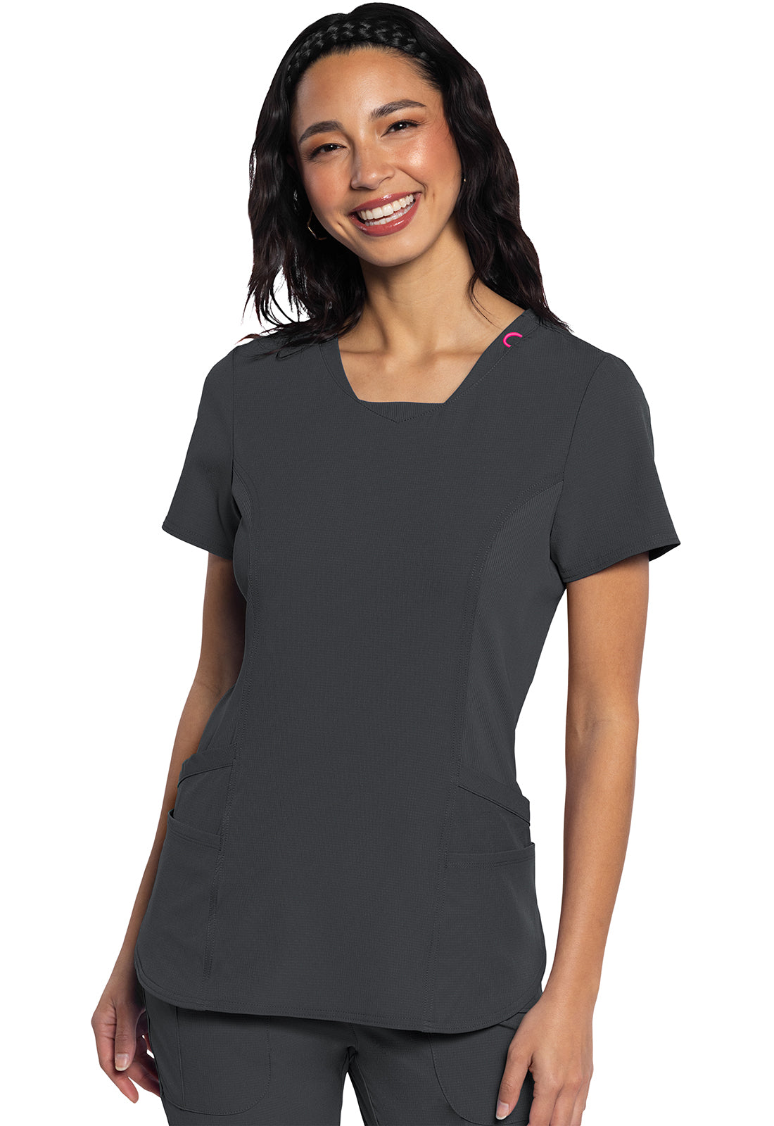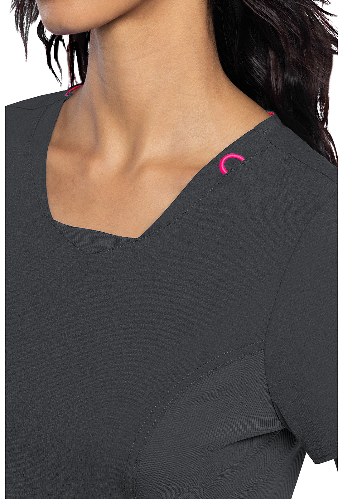 A fashionable update to a uniform favorite, this Med Couture Missy fit v-neck top features a stylized neckline with a dyed-to-match rib-knit inset. There is also a bungee ID badge loop at the neckline on the wearer's left side. Four pockets create organized storage with double patch pockets on each side. Front and back princess seams add shape and fit. Dyed-to match rib-knit side panels provide comfort and stretch while the cut-out vents at the hem add style and ease of movement. Locker loop at center back neck. Cap sleeves complete the look. Center back length: 26"