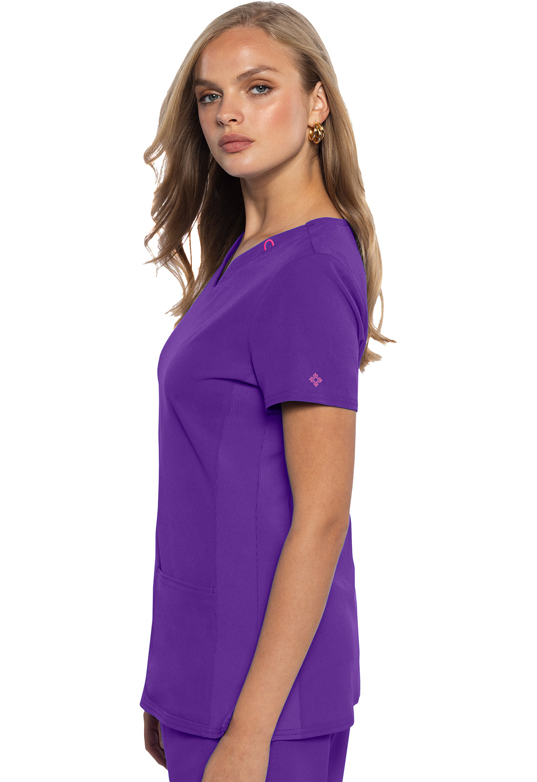 This Missy fit V-neck top has a shaped neckline with a bungee ID badge loop on the wearer's left side. There are three pockets for storage: two patch pockets plus an additional cell phone pocket with bar tacked pen slot. Twill tape instrument loops inside the wearer's right pocket for additional storage. Front and back princess seams add fit and shaping while dyed-to-match rib-knit side panels provide comfort and stretch. A rounded hem and side vents complete the look. Center back length: 25 ½"
