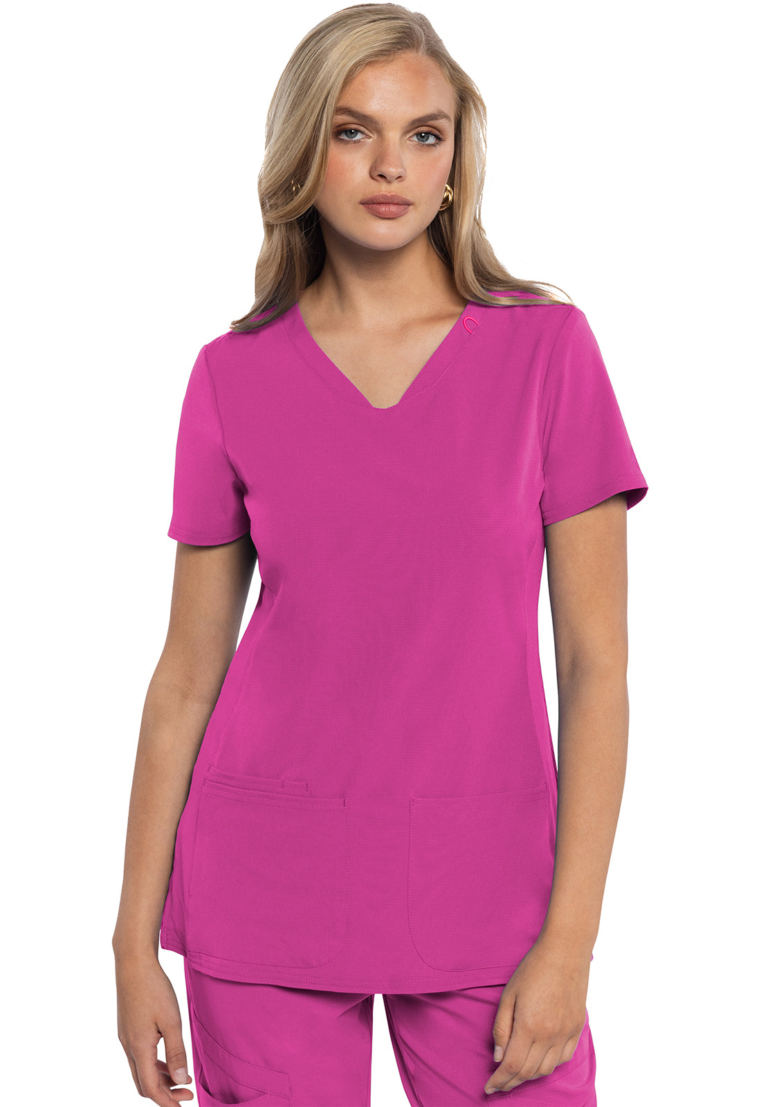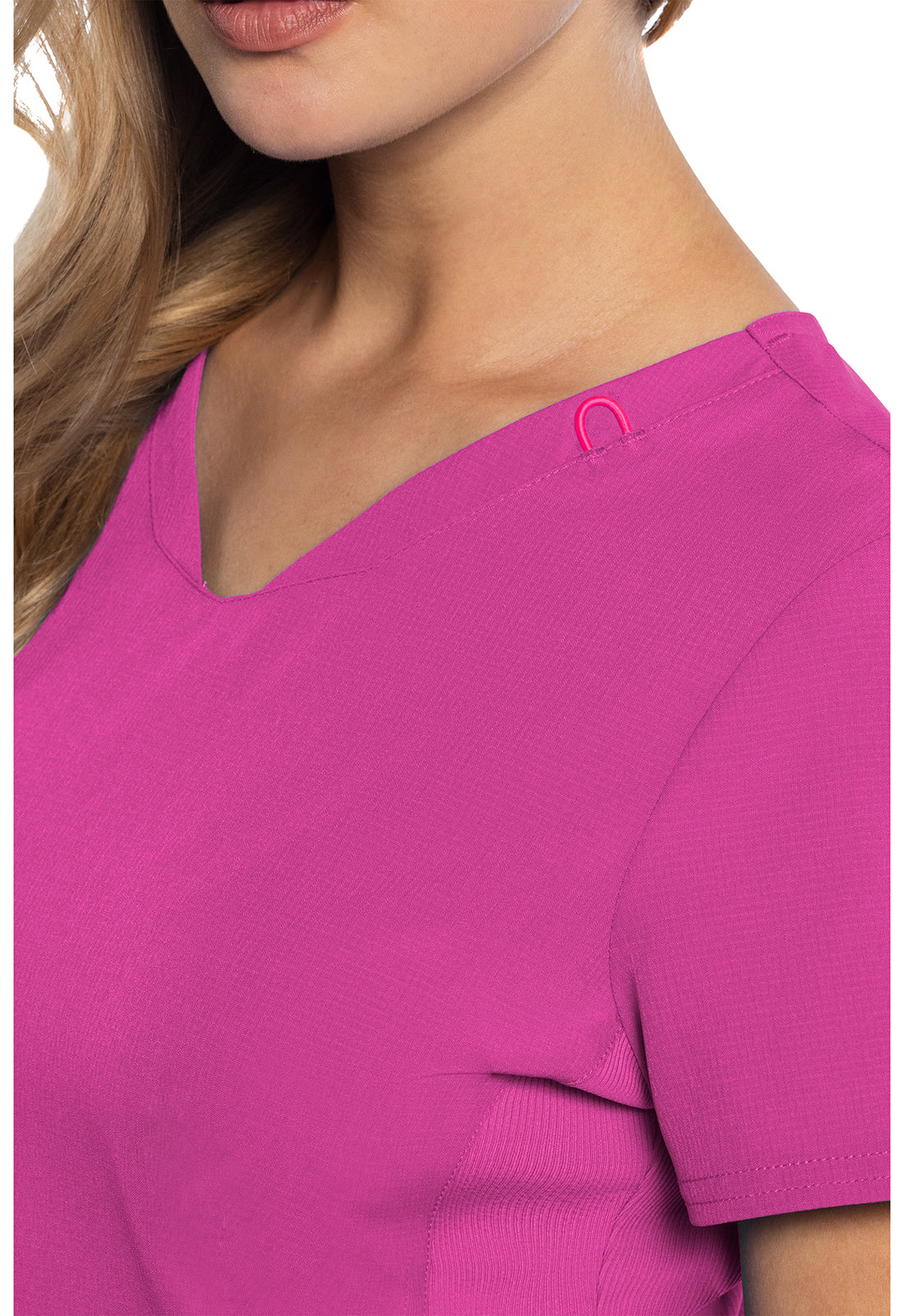 This Missy fit V-neck top has a shaped neckline with a bungee ID badge loop on the wearer's left side. There are three pockets for storage: two patch pockets plus an additional cell phone pocket with bar tacked pen slot. Twill tape instrument loops inside the wearer's right pocket for additional storage. Front and back princess seams add fit and shaping while dyed-to-match rib-knit side panels provide comfort and stretch. A rounded hem and side vents complete the look. Center back length: 25 ½"