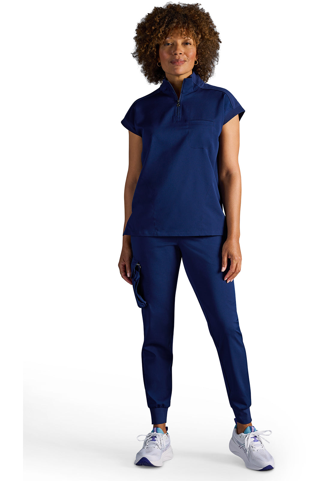 • The Healing Hands x Dr. Kwane Vienna top features a stand-up collar, quarter-zip opening, and short dolman sleeves. Dyed-to-match knit sleeves on the collar, shoulder panels, sleeve hems, and back yoke add style. There are three pockets for storage: one welt chest pocket and two welt side entry pockets. A high-low hem with side vents completes the look. Modern fit. Center back length: 26"