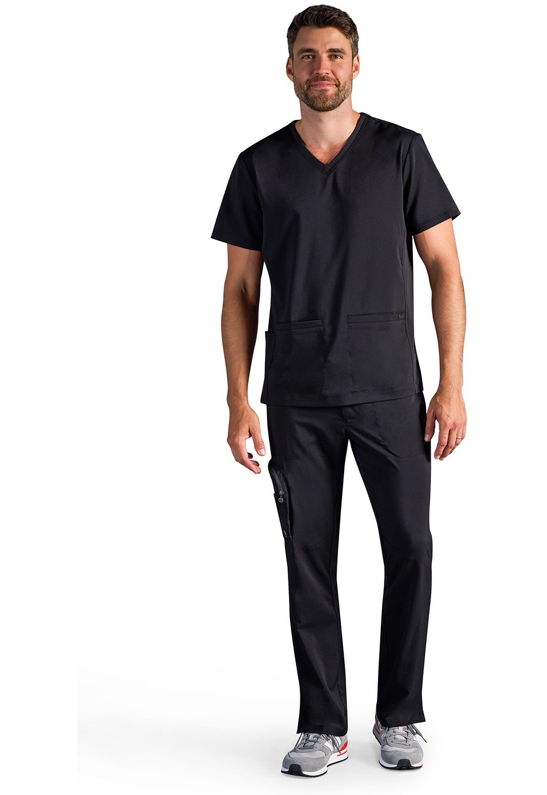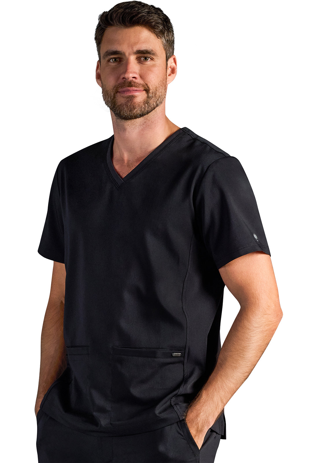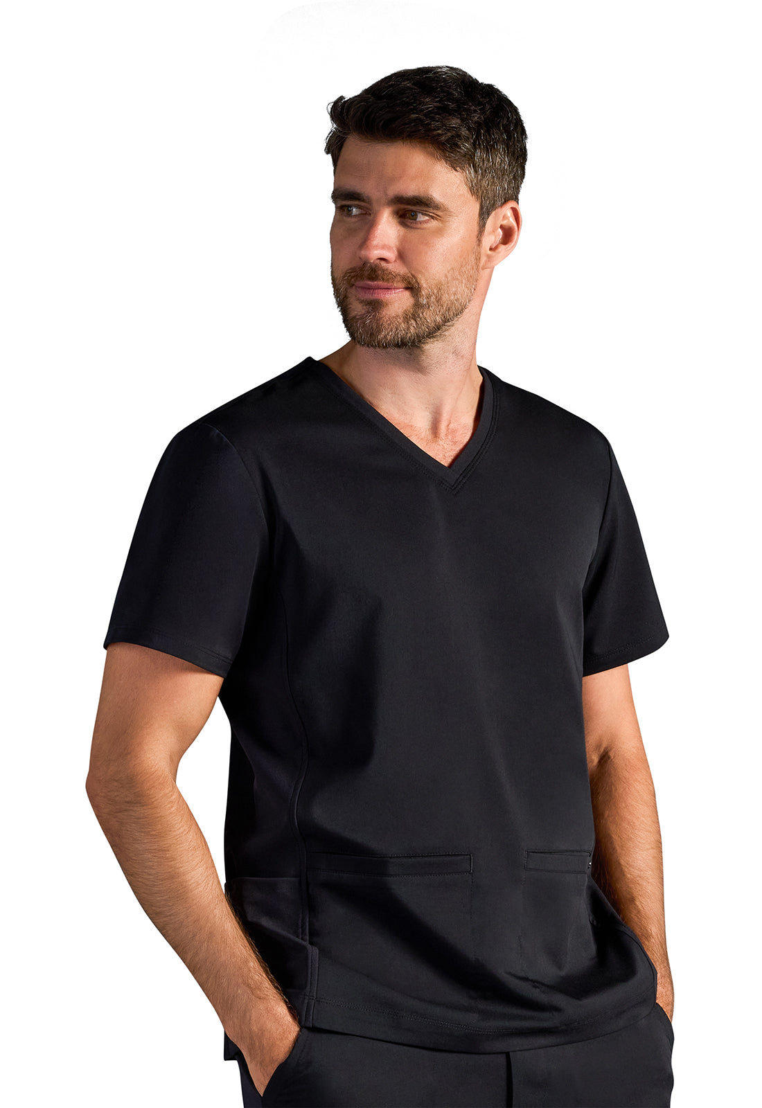 • Comfort and style combine in the Men's Vincent v-neck top from Healing Hands x Dr. Kwane. Dyed-to-match knit trim on neck band plus stylish and stretchy dyed-to-match knit side panels. There are four pockets for organized storage: two welt pockets, one hidden media pocket on the wearer's left side, and one right hip pocket. Hidden media pocket includes dyed-to-match knit trim at top of pocket. Front and back seams for fit. Back vents provide ease of movement. Modern fit. Center back length: 28 1/2"