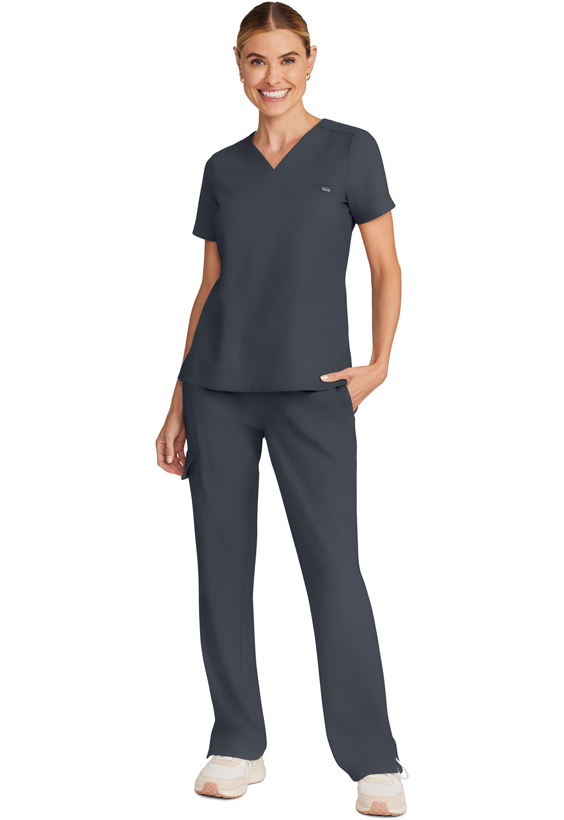 The Billie v-neck scrub top includes one welt chest pocket with a pretty printed pocket bag. Back darts provide fit and shaping. There is a curved hem with side vents for ease of movement. Thanks to the design, this style looks good worn tucked or untucked. The soft four-way stretch fabric includes moisture wicking for added comfort. Modern fit. Center back length (size Small): 25"