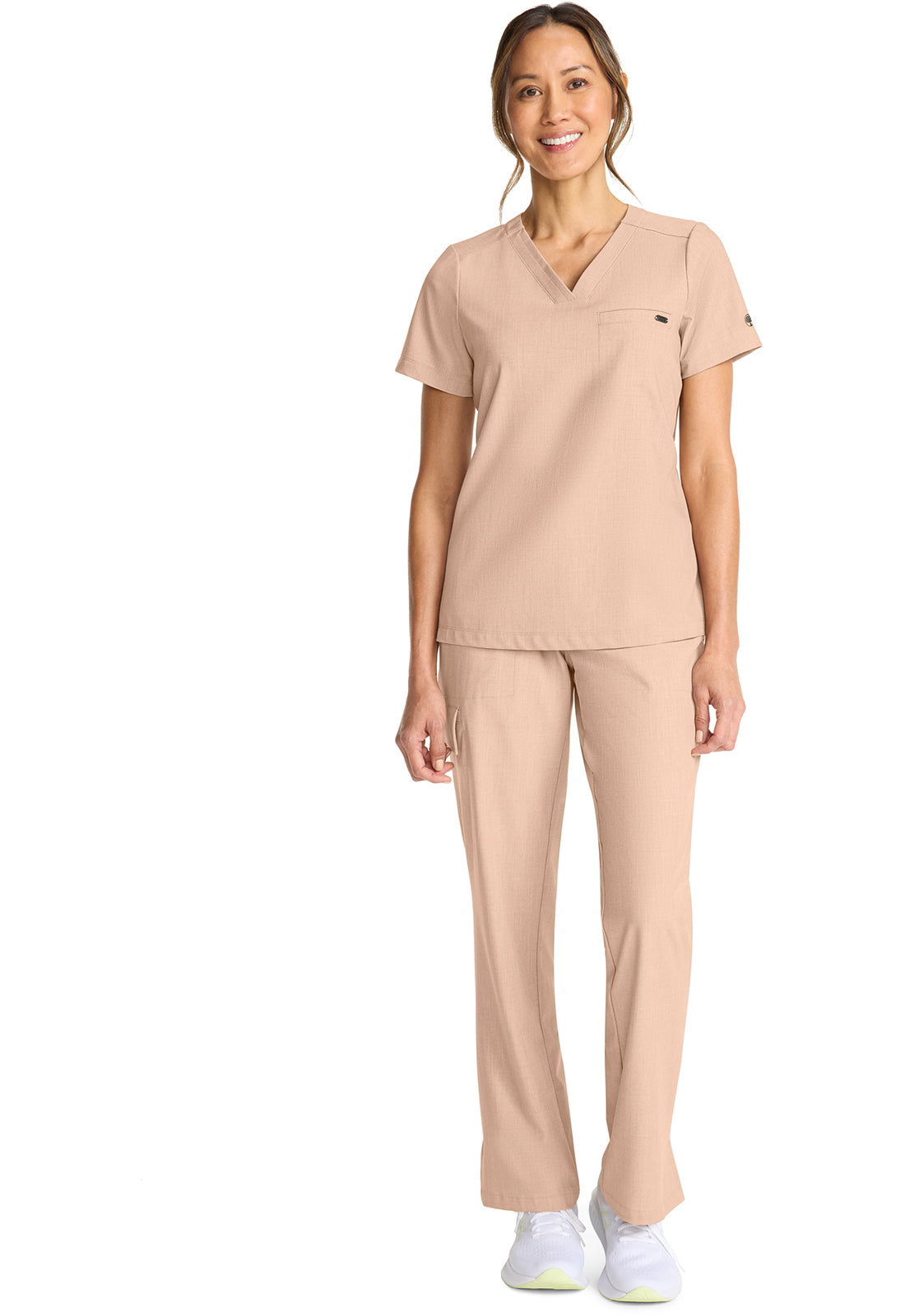 The Billie v-neck scrub top includes one welt chest pocket with a pretty printed pocket bag. Back darts provide fit and shaping. There is a curved hem with side vents for ease of movement. Thanks to the design, this style looks good worn tucked or untucked. The soft four-way stretch fabric includes moisture wicking for added comfort. Modern fit. Center back length (size Small): 25"