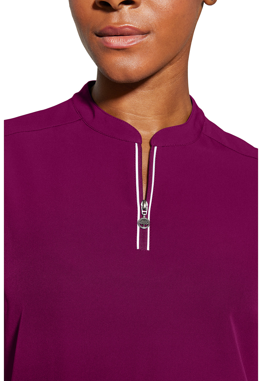 • Oversized comfy Mandarin Collar Boxy top features collared neckline with half zip, dolman sleeves, 2 welt pockets, rounded hem & back yoke box pleat detail. Knit trim at front shoulder and back yoke add to this tops charm.