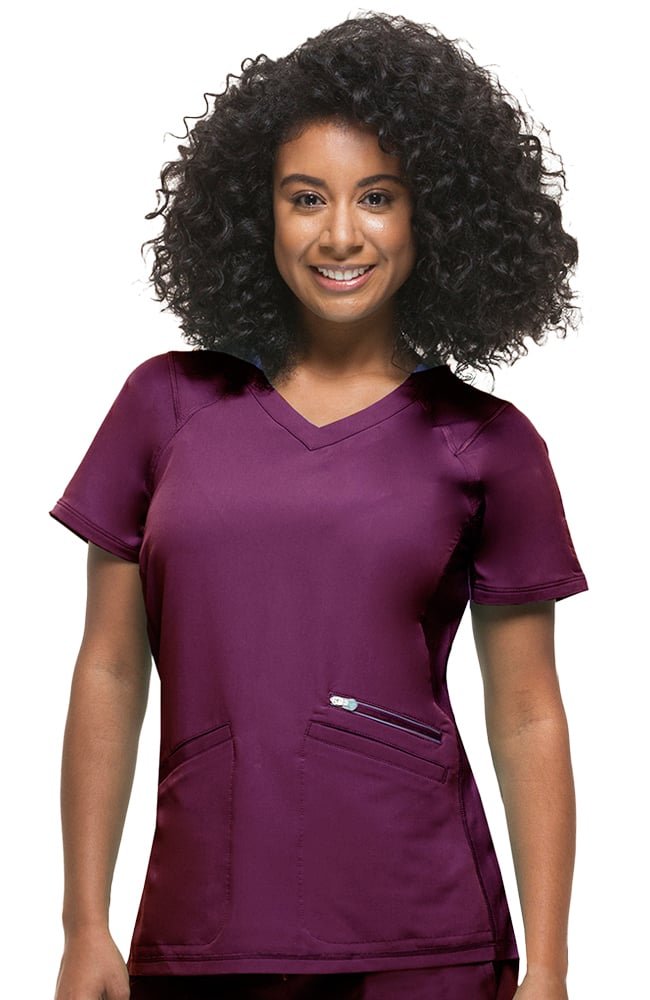 Serena V-Neck Top features texture fabric details on the shoulders and side panels that wick moisture quickly to keep you dry and comfortable. The stylish raglan sleeves, front and back princess seams, back darts, and side slits make for a fitted professional look.