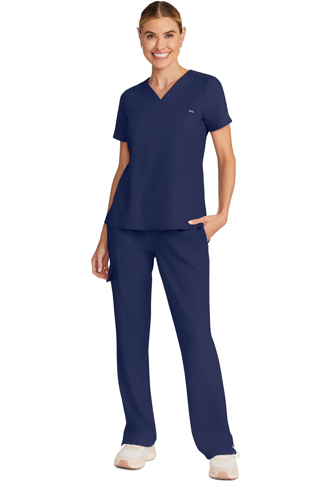 The Billie v-neck scrub top includes one welt chest pocket with a pretty printed pocket bag. Back darts provide fit and shaping. There is a curved hem with side vents for ease of movement. Thanks to the design, this style looks good worn tucked or untucked. The soft four-way stretch fabric includes moisture wicking for added comfort. Modern fit. Center back length (size Small): 25"