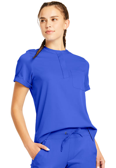 • This Macy Top is crafted with the ideal blend of soft yet durable fabric. It features 1 chest pocket and a stylish Mandarin collar with a half placket. The high-low hem and side vents allow for ease of movement, while the French cuffs and Modern fit create a flattering silhouette. Center back length: 25".