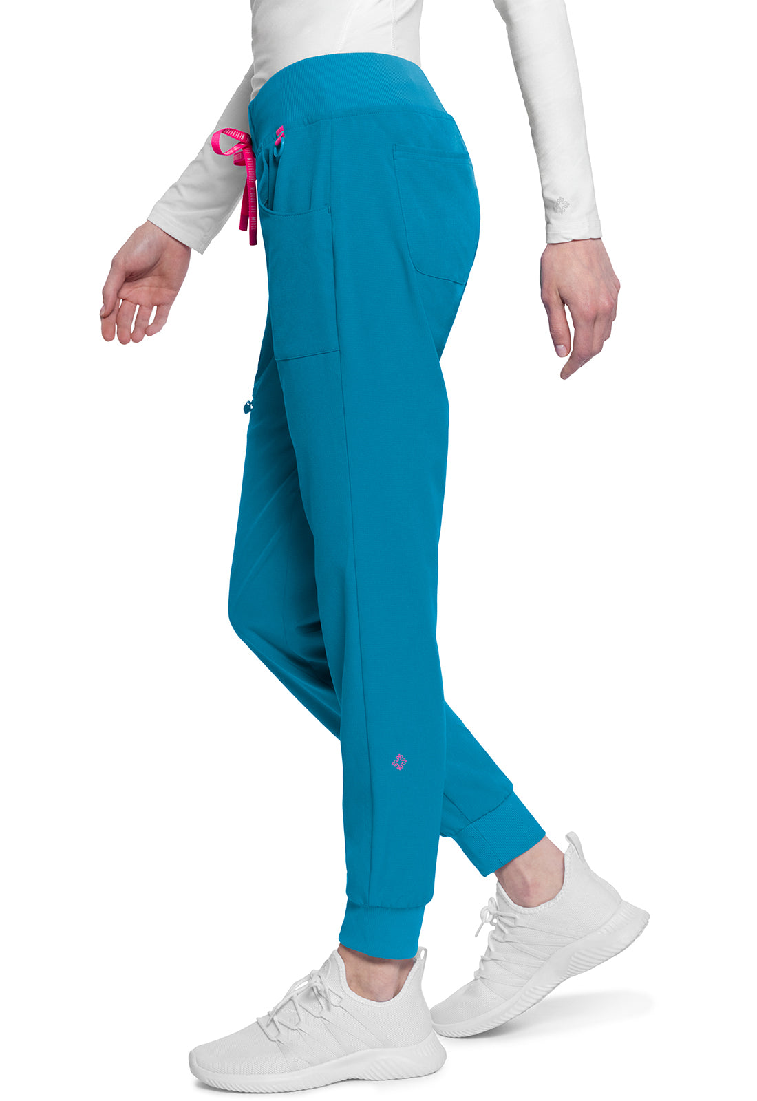 This Missy fit mid rise jogger features a rib-knit covered elastic reinforced waistband with signature color logo drawstring. There is a d-ring at the waistband and a locker loop at the center back waist. There are five pockets for organized storage: two front pockets (right with pen/instrument slot), one zipper cargo pocket, and two back patch pockets. Dyed-to-match rib-knit cuffs complete this jogger pant. Tapered jogger leg, 8 5/8" leg opening. Inseam: 29"